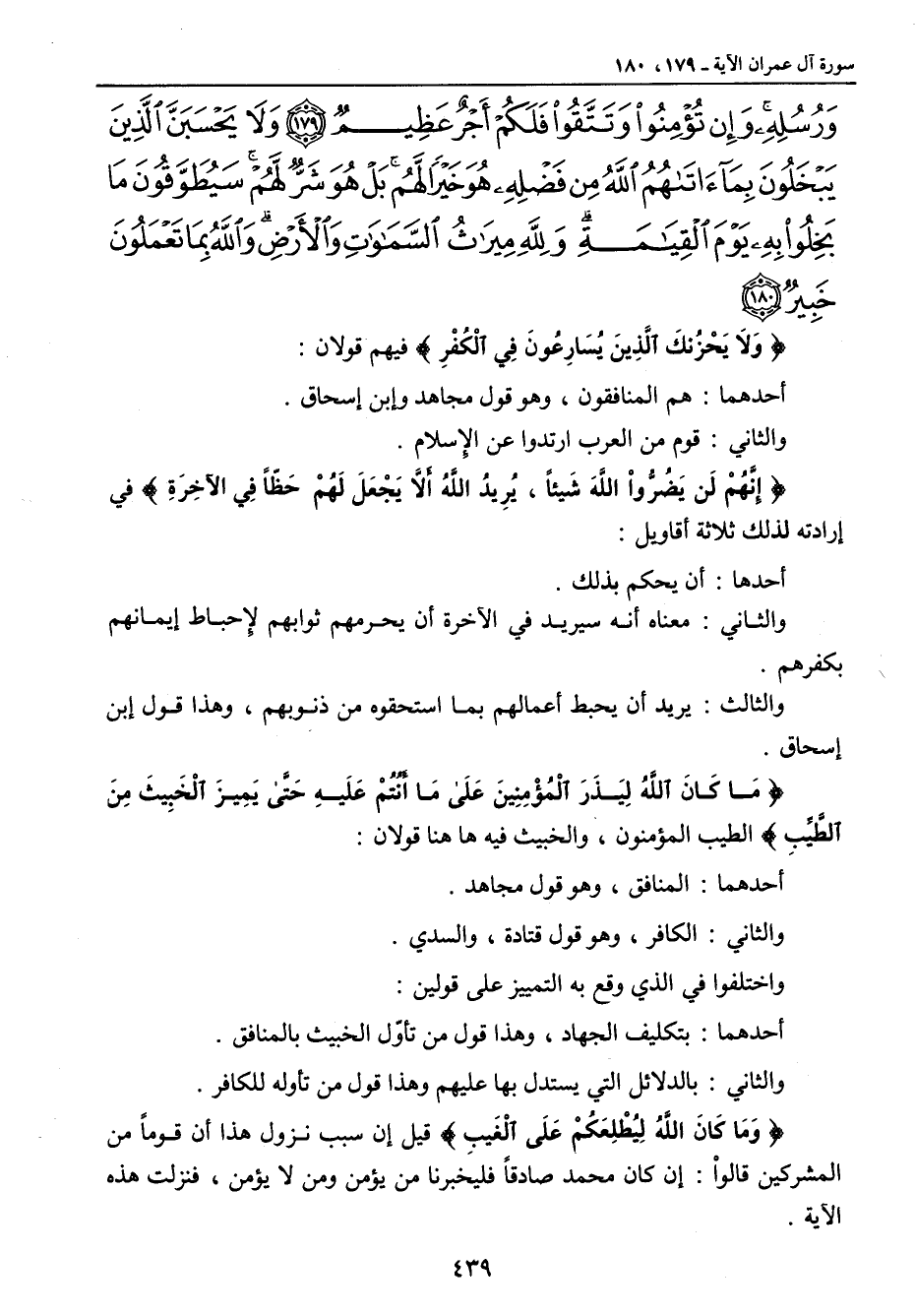 ورسله وإن تؤمنوا وتتقوا فلكم أجر عظيم ولا يحسبن الذين يبخلون بما آتاهم الله من فضله هو خيرا لهم بل هو شر لهم سيطوقون ما بخلوا به يوم القيامة ولله ميراث السماوات والأرض والله بما تعملون خبير} {وَلاَ يَحْزُنكَ الَّذِينَ يُسَارِعُونَ فِي الْكُفْرِ} فيهم قولان: أحدهما: هم المنافقون وهو قول مجاهد وابن إسحاق. والثاني: قوم من العرب ارتدوا عن الإسلام. {إِنَّهُمْ لَن يَضُرُّوا اللهَ شَيئاً , يُرِيدُ اللهُ أَلاَّ يَجْعَلَ لَهُمْ حَظّاً فِي الآخِرةِ} في إرادته لذلك ثلاثة أقاويل: أحدها: أن يحكم بذلك. والثاني: معناه أنه سيريد في الآخرة أن يحرمهم ثوابهم لإحباط إيمانهم بكفرهم. والثالث: يريد أن يحبط أعمالهم بما استحقوه من ذنوبهم , وهذا قول ابن إسحاق. {مَا كَانَ اللَّهُ لِيَذَرَ الْمُؤْمِنِينَ عَلَى مَا أَنتُمْ عَلَيهِ حَتَّى يَمِيزَ الْخَبِيثَ مِنَ الطَّيِّبِ} الطيب المؤمنون , والخبيث فيه ها هنا قولان: أحدهما المنافق , وهو قول مجاهد. والثاني: الكافر , وهو قول قتادة , والسدي. واختلفوا في الذي وقع به التمييز على قولين: أحدهما: بتكليف الجهاد , وهذا قول من تأوّل الخبيث بالمنافق. والثاني: بالدلائل التي يستدل بها عليهم وهذا قول من تأوله للكافر. {وَمَا كَانَ اللهُ لِيُطْلِعَكُمْ عَلَى الْغَيبِ} قيل إن سبب نزول هذا أن قوماً من المشركين قالواْ: إن كان محمد صادقاً فليخبرنا من يؤمن ومن لا يؤمن , فنزلت هذه الآية.