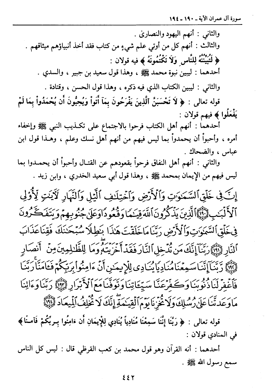 {إن في خلق السماوات والأرض واختلاف الليل والنهار لآيات لأولي الألباب الذين يذكرون الله قياما وقعودا وعلى جنوبهم ويتفكرون في خلق السماوات والأرض ربنا ما خلقت هذا باطلا سبحانك فقنا عذاب النار ربنا إنك من تدخل النار فقد أخزيته وما للظالمين من أنصار ربنا إننا سمعنا مناديا ينادي للإيمان أن آمنوا بربكم فآمنا ربنا فاغفر لنا ذنوبنا وكفر عنا سيئاتنا وتوفنا مع الأبرار ربنا وآتنا ما وعدتنا على رسلك ولا تخزنا يوم القيامة إنك لا تخلف الميعاد} قوله تعالى: {رَبَّنَا إِنَّنَا سَمِعْنَا مُنَادِياً يُنَادِي لِلإِيمَانِ أَنءَامِنُوا ِبربِّكُمْ فَآمنّا} في المنادي قولان: أحدهما: أنه القرآن وهو قول محمد بن كعب القرظي قال: ليس كل الناس سمع رسول الله صلى الله عليه وسلم.
