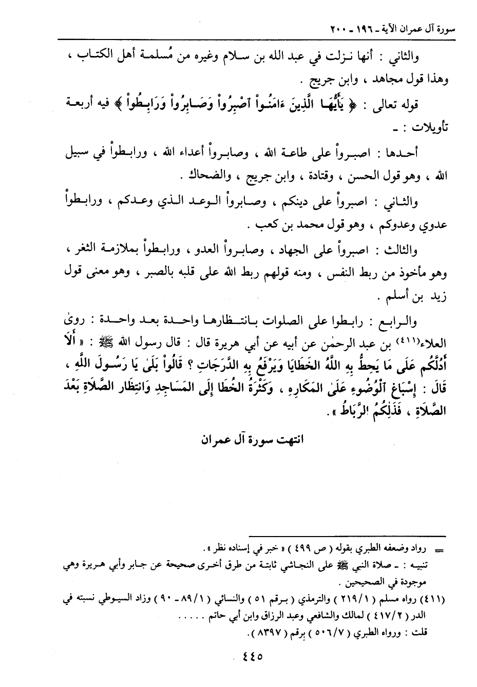 والثاني: أنها نزلت في عبد الله بن سلام وغيره من مُسلمة أهل الكتاب , وهذا قول مجاهد , وابن جريج. قوله تعالى: {يَاَ أيُّهَا الَّذِينَءَامَنُواْ أصْبِرُواْ وَصَابِرُواْ وَرَابِطُوا} فيه أربعة تأويلات: - أحدها: اصبرواْ على طاعة الله , وصابرواْ أعداء الله , ورابطواْ في سبيل الله , وهو قول الحسن , وقتادة , وابن جريج , والضحاك. والثاني: اصبرواْ على دينكم , وصابرواْ الوعد الذي وعدكم , ورابطواْ عدوي وعدوكم , وهو قول محمد بن كعب. والثالث: اصبرواْ على الجهاد , وصابرواْ العدو , ورابطواْ بملازمة الثغر , وهو مأخوذ من ربط النفس , ومنه قولهم ربط الله على قلبه بالصبر , وهو معنى قول زيد بن أسلم. والرابع: رابطوا على الصلوات بانتظارها واحدة بعد واحدة: روى العلاء بن عبد الرحمن عن أبيه عن أبي هريرة قال: قال رسول الله صلى الله عليه وسلم: (أَلاَ أَدُلَّكُم عَلَى مَا يَحِطُّ بِه اللهُ الخَطَايَا ويَرْفُعُ بِهِ الدَّرَجَاتِ؟ قَالُواْ بَلَى يَا رَسُولَ الله , قَالَ: إِسْبَاغِ الْوُضُوءِ عَلَى المَكَارِهِ , وَكَثْرةُ الخُطَا إلىَ المَسَاجِدِ وَانتِظار الصَّلاَةِ بَعْدَ الصَّلاةِ , فَذّلِكُمُ الرَّباط). انتهت سورة آل عمران