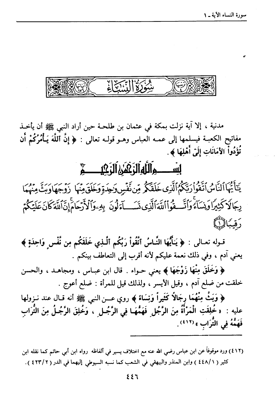 {يا أيها الناس اتقوا ربكم الذي خلقكم من نفس واحدة وخلق منها زوجها وبث منهما رجالا كثيرا ونساء واتقوا الله الذي تساءلون به والأرحام إن الله كان عليكم رقيبا} قوله تعالى: {يَا أَيُّهَا النَّاسُ اتَّقُواْ رَبَّكُم الَّذِي خَلَقَكُم مِن نَّفْسٍ وَاحِدَةٍ} يعني آدم , وفي ذلك نعمة عليكم لأنه أقرب إلى التعاطف بينكم. {وَخَلَقَ مِنْهَا زَوْجَهَا} يعني حواء , قال ابن عباس , ومجاهد , والحسن خلقت من ضلع آدم , وقيل الأيسر , ولذلك قيل للمرأة: ضلع أعوج. {وَبَثَّ مِنْهُمَا رِجَالاً كَثيراً وَنِسَاءً} روي عن النبي صلى الله عليه وسلم أنه قال عند نزولها عليه: (خُلِقَتِ الْمَرْأَةُ مِنَ الرَّجُلِ فَهَمَّهَا فِي الرَّجُلُ مِنَ التَّرابِ فَهَمُّهُ فِي التُّرابِ).