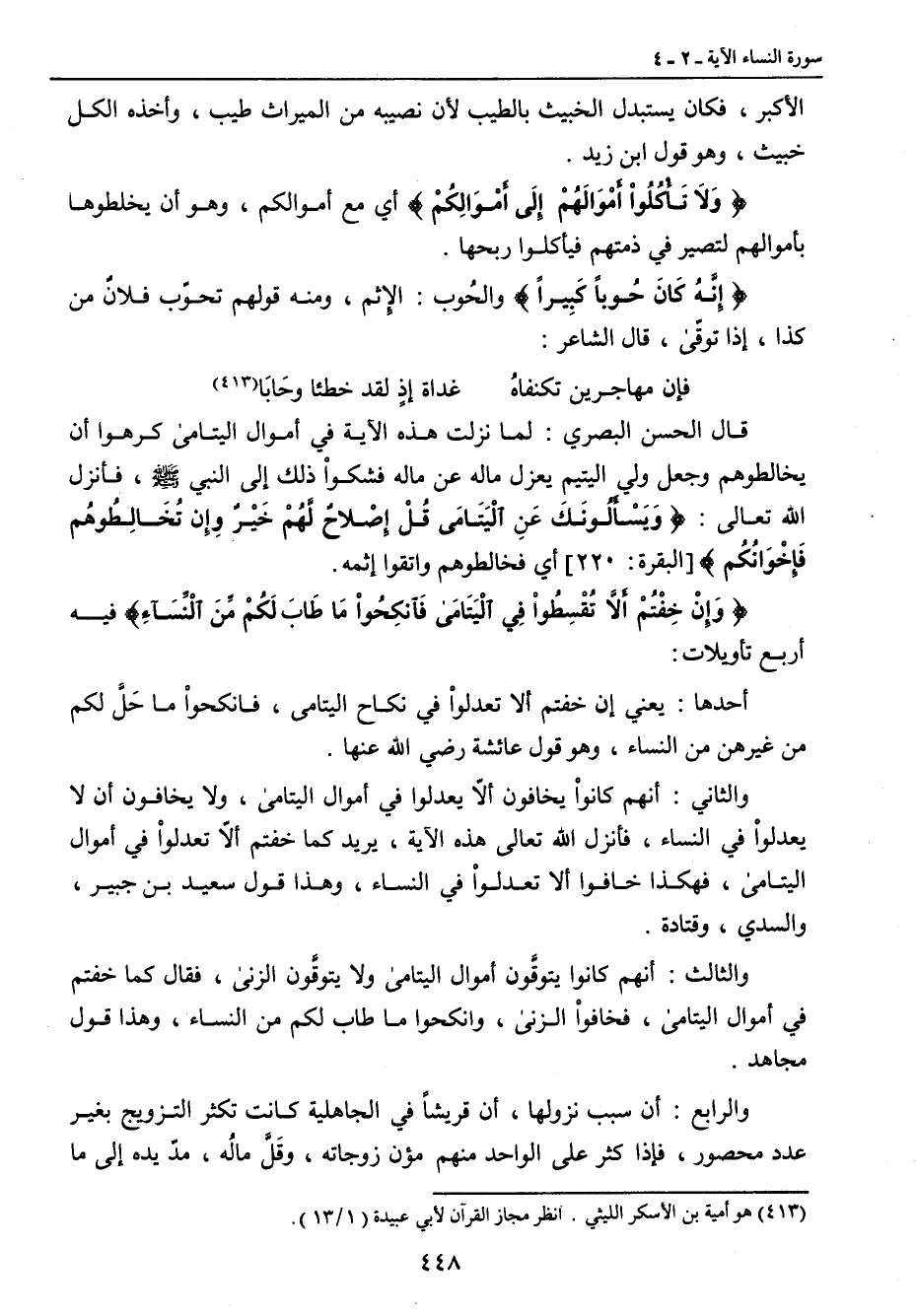 قال الحسن البصري: لما نزلت هذه الآية في أموال اليتامى كرهوا أن يخالطوهم وجعل ولي اليتيم يعزل ماله عن ماله فشكواْ ذلك إلى النبي صلى الله عليه وسلم , فأنزل الله تعالى: {وَيَسْأَلُونَكَ عَنِ الْيَتَامَى قُلْ إِصْلاحٌ لَّهُمْ خَيْرٌ وَإِن تُخَالِطُوهُم فَإِخْوَانُكُم} [البقرة: 220] أي فخالطوهم واتقوا إثمه. {وَإِنْ خِفْتُمْ أَلاَّ تُقْسِطُواْ فِي الْيَتَامَى فَانكِحُواْ مَا طَابَ لَكُمْ مِّنَ الْنِّسَآءِ} فيه أربع تأويلات: أحدها: يعني إن خفتم ألا تعدلواْ في نكاح اليتامى , فانكحوا ما حَلَّ لكم من غيرهن من النساء , وهو قول عائشة رضي الله عنها. والثاني: أنهم كانواْ يخافون ألاّ يعدلوا في أموال اليتامى , ولا يخافون أن لا يعدلواْ في النساء , فأنزل الله تعالى هذه الآية , يريد كما خفتم ألاّ تعدلواْ في أموال اليتامى , فهكذا خافوا ألا تعدلوا في النساء , وهذا قول سعيد بن جبير , والسدي , وقتادة. والثالث: أنهم كانوا يتوقَّون أموال اليتامى ولا يتوقَّون الزنى , فقال كما خفتم في أموال اليتامى , فخافواْ الزنى , وانحكوا ما طاب لكم من النساء , وهذا قول مجاهد. والرابع: إن سبب نزولها , أن قريشاً في الجاهلية كانت تكثر التزويج بغير عدد محصور , فإذا كثر على الواحد منهم مؤن زوجاته , وقَلَّ مالُه , مدّ يده إلى ما