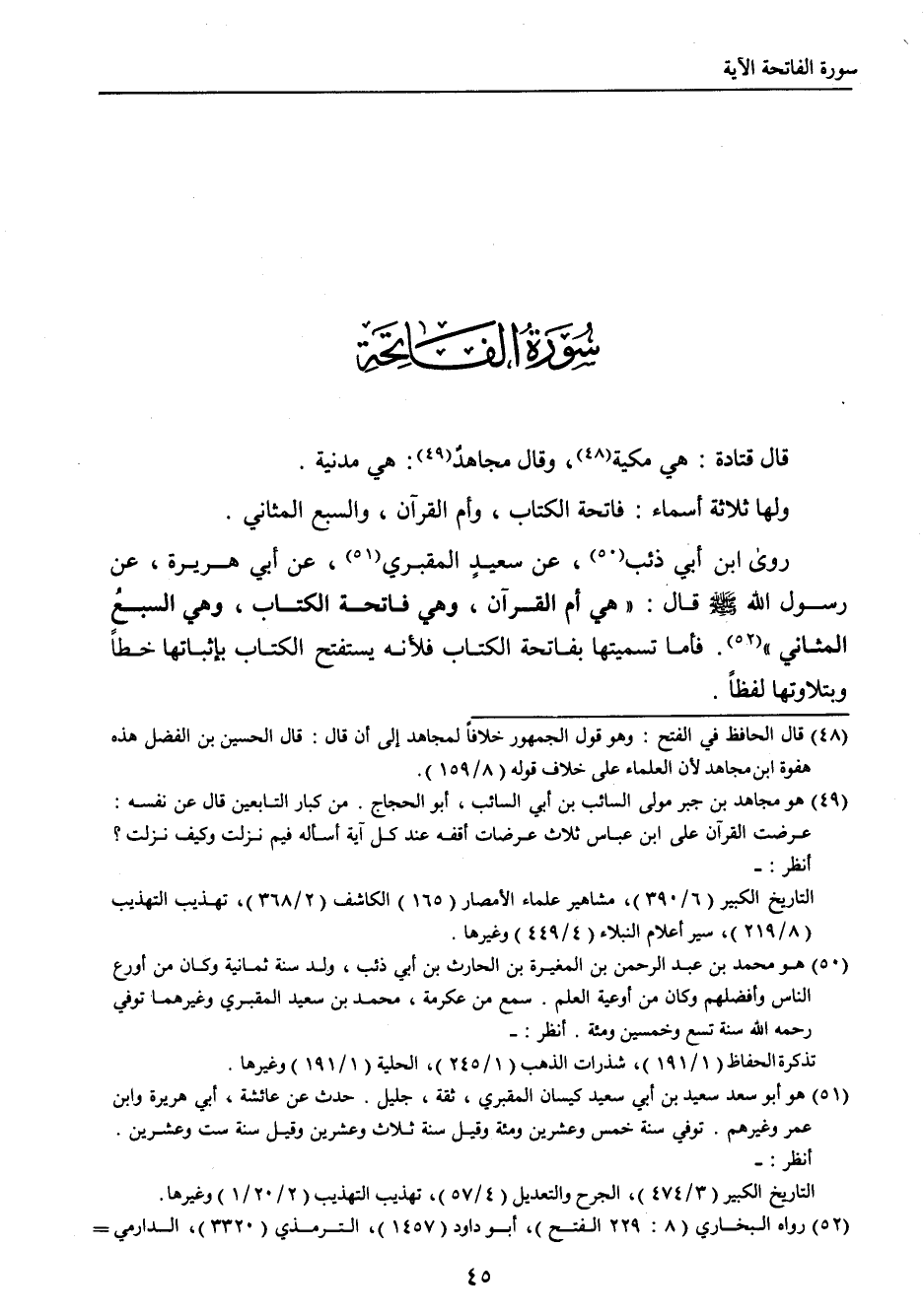 روى ابن أبي ذئب، عن سعيد المقبري، عن أبي هريرة، عن رسول الله صلى الله عليه وسلم قال: " هي أم القرآن، وهي فاتحة الكتاب، وهي السبع المثاني ". فأما تسميتها بفاتحة الكتاب فلأنه يستفتح الكتاب بإثباتها خطاً وبتلاوتها لفظاً.