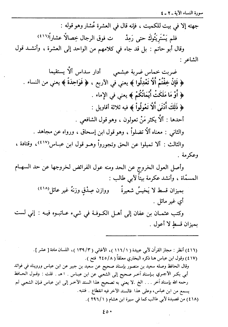 {فَإِنْ خِفْتُمْ أَلاَّ تَعْدِلُوا} يعني في الأربع , {فَوَاحِدَةً} يعني من النساء. {أَوْ مَا مَلَكَتْ أَيْمَانُكُمْ} يعني في الإماء. {ذَلِكَ أَدْنَى أَلاَّ تَعُولُواْ} فيه ثلاثة أقاويل: أحدها: أَلاَّ يكثر مَنْ تعولون , وهو قول الشافعي. والثاني: معناه ألاّ تضلواْ , وهو قول ابن إسحاق , ورواه عن مجاهد. والثالث: ألا تميلوا عن الحق وتجوروا وهو قول ابن عباس , وقتادة , وعكرمة. وأصل العول الخروج عن الحد ومنه عول الفرائض لخروجها عن حد السهام المسمّاة , وأنشد عكرمة بيتاً لأبي طالب: