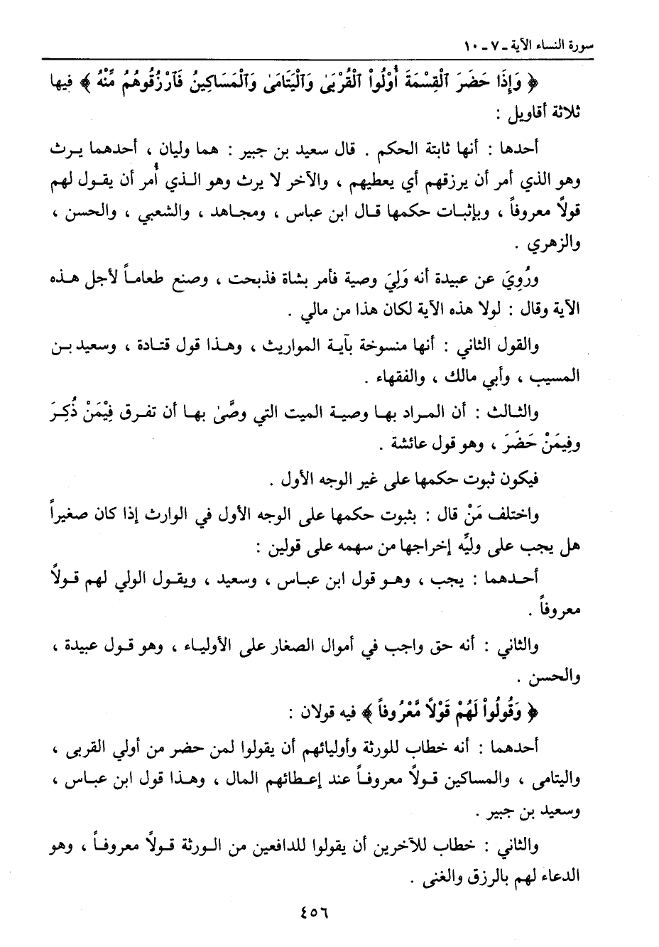 {وَإِذَا حَضَرَ الْقِسْمَةَ أُولُواْ الْقُرْبَى وَالْيَتَامَى وَالْمَسَاكِينُ فَارْزُقُوهُمُ مِّنْهُ} فيها ثلاثة أقاويل: أحدها: أنها ثابتة الحكم. قال سعيد بن جبير: هما وليان , أحدهما يرث وهو الذي أمر أن يرزقهم أي يعطيهم , والآخر لا يرث وهو الذي أُمر أن يقول لهم قولاً معروفاً , وبإثبات حكمها قال ابن عباس , ومجاهد , والشعبي , والحسن , والزهري. ورُوْي عن عبيدة أنه وَليَ وصية فأمر بشاة فذبحت , وصنع طعاماً لأجل هذه الآية وقال: لولا هذه الآية لكان هذا من مالي. والقول الثاني: أنها منسوخة بآية المواريث , وهذا قول قتادة , وسعيد بن المسيب , وأبي مالك , والفقهاء. والثالث: أن المراد بها وصية الميت التي وصَّى بها أن تفرق فِيْمَنْ ذُكِرَ وفِيمَنْ حَضَرَ , وهو قول عائشة. فيكون ثبوت حكمها على غير الوجه الأول. واختلف مَنْ قال: بثبوت حكمها على الوجه الأول في الوارث إذا كان صغيراً هل يجب على وليَّه إخراجها من سهمه على قولين: أحدهما: يجب , وهو قول ابن عباس , وسعيد , ويقول الولي لهم قولاً معروفاً. والثاني: أنه حق واجب في أموال الصغار على الأولياء , وهو قول عبيدة , والحسن. {وَقُولُواْ لَهُمْ قَوْلاً مَّعْرُوفاً} فيه قولان: أحدهما: أنه خطاب للورثة وأوليائهم أن يقولوا لمن حضر من أولي القربى , واليتامى , والمساكين قولاً معروفاً عند إعطائهم المال , وهذا قول ابن عباس , وسعيد بن جبير. والثاني: خطاب للآخرين أن يقولوا للدافعين من الورثة قولاً معروفاً , وهو الدعاء لهم بالرزق والغنى.