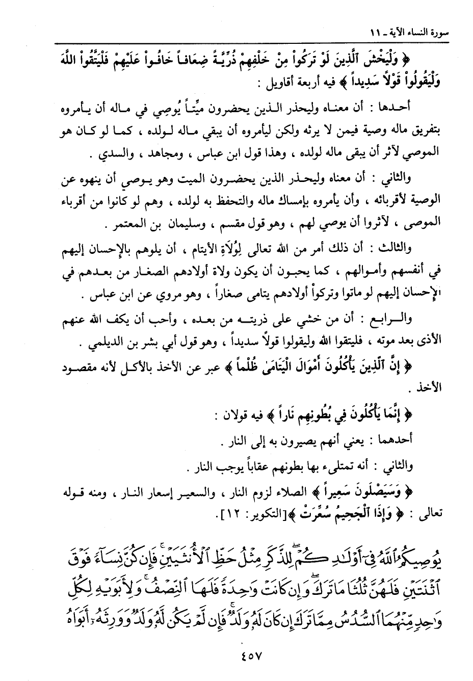 {وَلْيَخْشَ الَّذِينَ لَوْ تَرَكُواْ مِنْ خَلْفِهِمْ ذُرِّيَّةً ضِعَافاً خَافُواْ عَلَيْهِمْ فَلْيَتَّقُواْ اللهَ وَلْيَقُولُواْ قَوْلاً سَدِيداً} فيه أربعة أقاويل: أحدها: أن معناه وليحذر الذين يحضرون مَّيتاً يوصي في ماله أن يأمروه بتفريق ماله وصية فيمن لا يرثه ولكن ليأمروه أن يبقى ماله لولده , كما لو كان هو الموصي لآثر أن يبقة ماله لولده , وهذا قول ابن عباس , ومجاهد , والسدي. والثاني: أن معناه وليحذر الذين يحضرون الميت وهو يوصي أن ينهوه عن الوصية لأقربائه , وأن يأمره بإمساك ماله والتحفظ به لولده , وهم لو كانوا من أقرباء الموصى لآثروا أن يوصي لهم , وهو قول مقسم , وسليمان بن المعتمر. والثالث: أن ذلك أمر من الله تعالى لِوُلاَةِ الأيتام , أن يلوهم بالإحسان إليهم في أنفسهم وأموالهم , كما يحبون أن يكون ولاة أولادهم الصغار من بعدهم في الإحسان إليهم لو ماتوا وترمواْ أولادهم يتامى صغاراً , وهو مروي عن ابن عباس. والرابع: أن من خشي على ذريته من بعده , وأحب أن يكف الله عنهم الأذى بعد موته , فليتقوا الله وليقولا قولاً سديداً , وهو قول أبي بشر بن الديلمي. {إِنَّ الَّذِينَ يَأْكُلُونَ أَمْوَالَ الْيَتَامَى ظُلْماً} عبر عن الأخذ بالأكل لأنه مقصود الأخذ. {إِنَّمَا يَأْكُلُونَ فِي بُطُونِهِم نَاراً} فيه قولان: أحدهما: يعني انهم يصيرون به إلى النار. والثاني: أنه تمتلىء بها بطونهم عقاباً يوجب النار. {وَسَيَصْلَونَ سَعِيراً} الصلاء لزوم النار , والسعير إسعار النار , ومنه قوله تعالى: {وَإِذَا الْجَحِيمُ سُعِّرَتْ} [التكوير: 12].