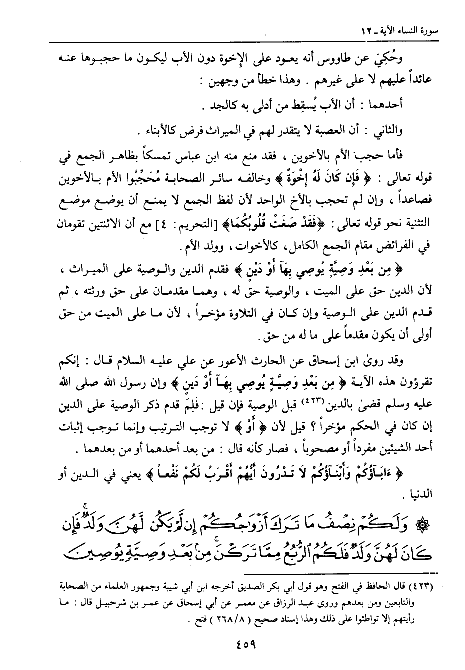 وحُكِيَ عن طاووس أنه يعود على الإِخوة دون الأب ليكون ما حجبوها عنه عائداً عليهم لا على غيرهم. وهذا خطأ من وجهين: أحدهما: أن الأب يُسقِط من أدلى به كالجد. والثاني: أن العصبة لا يتقدر لهم في الميراث فرض كالأبناء. فأما حجب الأم بالأخوين , فقد منع منه ابن عباس تمسكاً بظاهر الجمع في قوله تعالى: {فَإِن كَانَ لَهُ إِخْوَةٌ} وخالفه سائر الصحابة مُحَجِّبُوا الأم بالأخوين فصاعداً , وإن لم تحجب بالأخ الواحد لأن لفظ الجمع لا يمنع أن يوضع موضع التثنية نحو قوله تعالى: {فَقَدْ صَغَتْ قُلُوبُكُمَا} [التحريم: 4] مع أن الاثنتين تقومان في الفرائض مقام الجمع الكامل , كالأخوات , وولد الأم. {مِن بَعْدِ وَصِيَّةٍ يُوصِي بِهَآ أَوْ دَينٍ} فقدم الدين والوصية على الميراث , لأن الدين حق على الميت , والوصية حق له , وهما مقدمان على حق ورثته , ثم قدم الدين على الوصية وإن كان في التلاوة مؤخراً , لأن ما على الميت من حق أولى أن يكون مقدماً على ما له من حق. وقد روى ابن إسحاق عن الحارث الأعور عن علي عليه السلام قال: إنكم تقرؤون هذه الآية {مِن بَعْدِ وَصِيَّةٍ يُوصِي بِهَآ أَوْ دَينٍ} وإن رسول الله صلى الله عليه وسلم قضى بالدين قبل الوصية فإن قيل: فَلِمَ قدم ذكر الوصية على الدين إن كان في الحكم مؤخراً؟ قيل لأن {أَوْ} لا توجب الترتيب وإنما توجب إثبات أحد الشيئين مفرداً أو مصحوباً , فصار كأنه قال: من بعد أحدهما أو من بعدهما. {ءَابآؤُكُمْ وَأَبْنَآؤُكُمْ لاَ تَدْرُونَ أَيُّهُمْ أَقْرَبُ لَكُمْ نَفْعاً} يعني في الدين أو الدنيا.