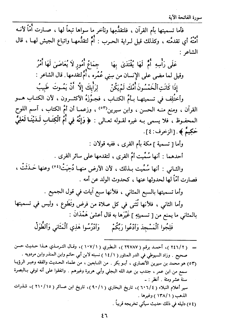 واختلف في تسميتها بأم الكتاب، فجوزه الأكثرون، لأن الكتاب هو القرآن، ومنع منه الحسن، وابن سيرين، وزعما أن أم الكتاب، اسم اللوح المحفوظ، فلا يسمى به غيره لقوله تعالى: {وَإِنَّهُ فِي أُمَّ الْكِتَابِ لَدَيْنَا لَعَلِيٌّ حَكِيمٌّ}. [الزخرف: 4].