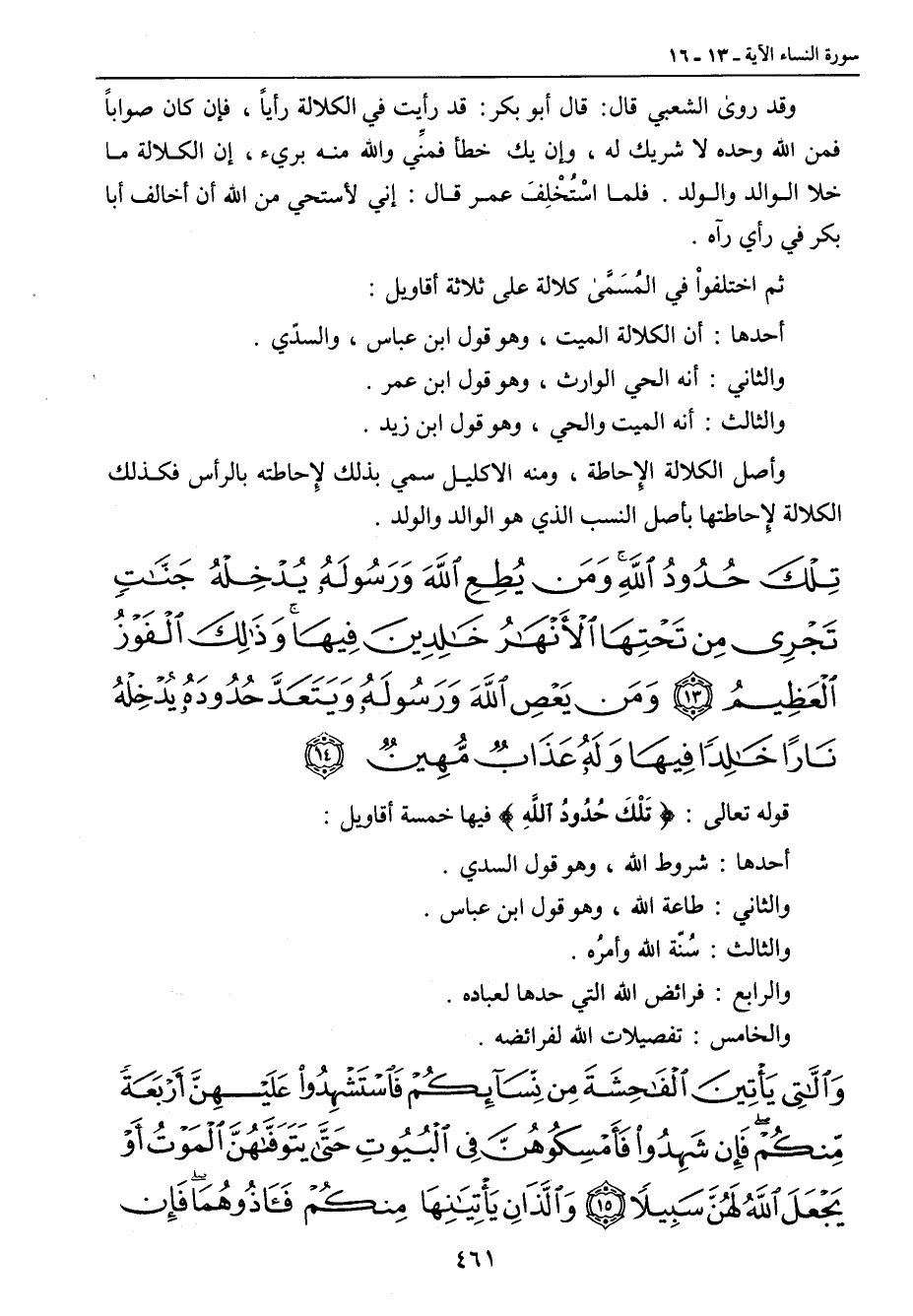 وقد روى الشعبي قال: قال أبو بكر: قد رأيت في الكلالة رأياً , فإن كان صواباً فمن الله وحده لا شريك له , وإن يك خطأ فمنِّي والله منه بريء , إن الكلالة ما خلا الوالد والولد. فلما اسْتُخْلِفَ عمر قال: إني لأستحي من الله أن أخالف أبا بكر في رأي رآه. ثم اختلفواْ في المُسَمَّى كلالة على ثلاثة أقاويل: أحدها: أن الكلالة الميت , وهو قول ابن عباس , والسدّي. والثاني: أنه الحي الوارث , وهو قول ابن عمر. والثالث: أنه الميت والحي , وهو قول ابن زيد. وأصل الكلالة الإِحاطة , ومنه الإكليل سمي بذلك لإِحاطته بالرأس فكذلك الكلالة لإِحاطتها بأصل النسب الذي هو الوالد والولد.
