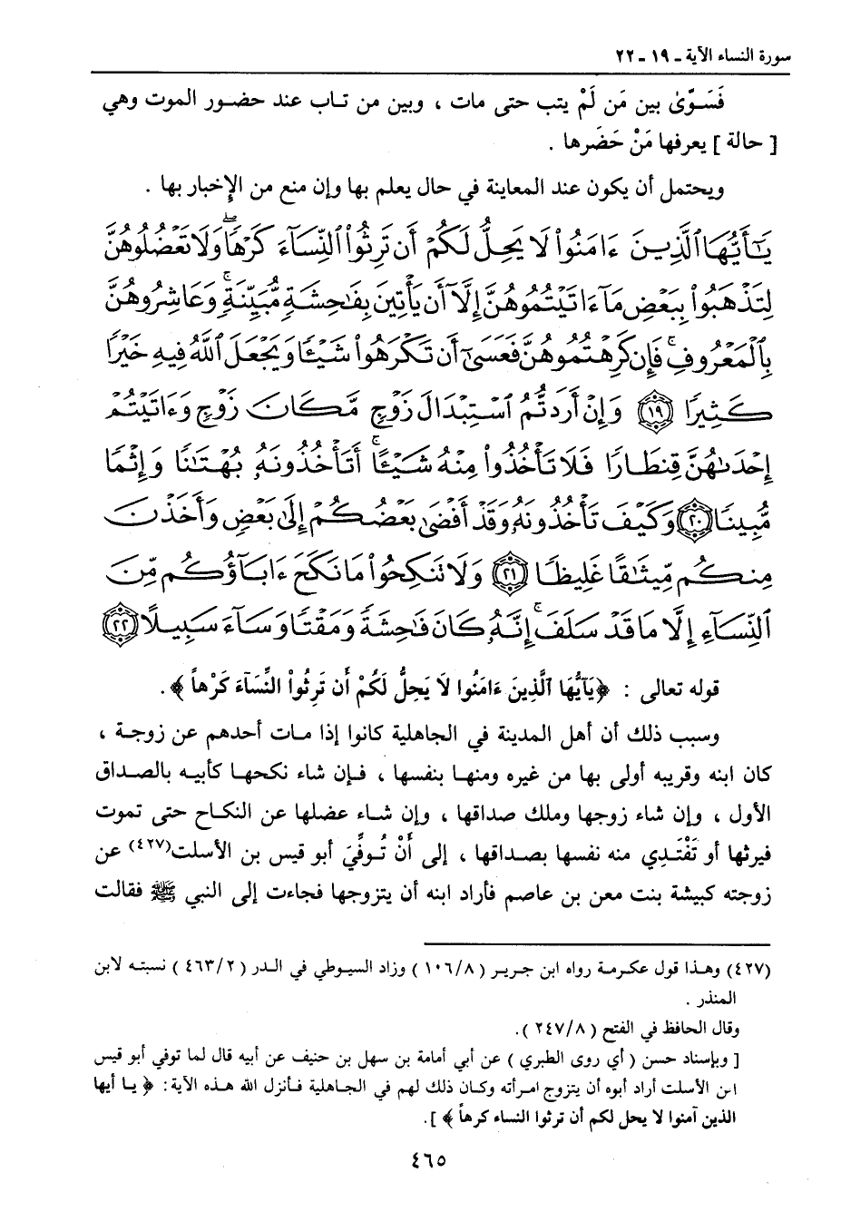 {يا أيها الذين آمنوا لا يحل لكم أن ترثوا النساء كرها ولا تعضلوهن لتذهبوا ببعض ما آتيتموهن إلا أن يأتين بفاحشة مبينة وعاشروهن بالمعروف فإن كرهتموهن فعسى أن تكرهوا شيئا ويجعل الله فيه خيرا كثيرا وإن أردتم استبدال زوج مكان زوج وآتيتم إحداهن قنطارا فلا تأخذوا منه شيئا أتأخذونه بهتانا وإثما مبينا وكيف تأخذونه وقد أفضى بعضكم إلى بعض وأخذن منكم ميثاقا غليظا ولا تنكحوا ما نكح آباؤكم من النساء إلا ما قد سلف إنه كان فاحشة ومقتا وساء سبيلا} قوله تعالى: {يَاأَيُّهَا الَّذِينَءَامَنُوا لاَ يَحِلُّ لَكُمْ أَن تَرِثُواْ النِّسَآءَ كَرْهاً}. وسبب ذلك أن أهل المدينة في الجاهلية كانوا إذا مات أحدهم عن زوجة , كان ابنه وقريبه أولى بها من غيره ومنها بنفسها , فإن شاء نكحها كأبيه بالصداق الأول , وإن شاء زوجها وملك صداقها , وإن شاء عضلها عن النكاح حتى تموت فيرثها أو تَفْتَدِي منه نفسها بصداقها , إلى أَنْ تُوفِّيَ أبو قيس بن الأسلت عن زوجته كبيشة بنت معن بن عاصم فأراد ابنه أن يتزوجها فجاءت إلى النبي صلى الله عليه وسلم فقالت