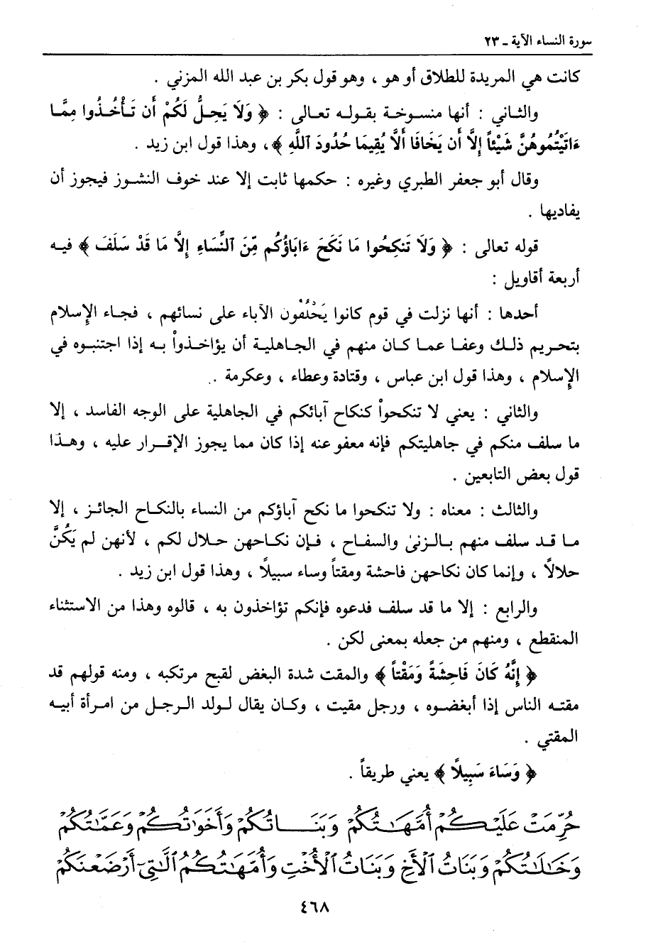 كانت هي المريدة للطلاق أو هو , وهو قول بكر بن عبد الله المزني. والثاني: أنها منسوخة بقوله تعالى: {وَلاَ يَحِلُّ لَكُمْ أَن تَأْخُذُوا مِمَّاءَاتَيْتُمُوهُنَّ شَيْئاً إِلاَّ أَن يَخَافَا أَلاَّ يُقِيمَا حُدُودَ اللهِ} , وهذا قول ابن زيد. وقال أبو جعفر الطبري وغيره: حكمها ثابت عند عن خوف النشوز فيجوز أن يفاديها. قوله تعالى: {وَلاَ تَنكِحُوا مَا نَكَحَءَابَاؤُكُم مِّنَ النِّسَاءِ إِلاَّ مَا قَدْ سَلَفَ} فيه أربعة أقاويل: أحدها: أنها نزلت في قوم كانوا يَحْلُفْون الآباء على نسائهم , فجاء الإسلام بتحريم ذلك وعفا عما كان منهم في الجاهلية أن يؤاخذواْ به إذا اجتنبوه في الإسلام , وهذا قول ابن عباس , وقتادة وعطاء , وعكرمة. والثاني: يعني لا تنكحواْ كنكاح آبائكم في الجاهلية على الوجه الفاسد , إلا ما سلف منكم في جاهليتكم فإنه معفو عنه إذا كان مما يجوز الإقرار عليه , وهذا قول بعض التابعين. والثالث: معناه: ولا تنكحوا ما نكح آباؤكم من النساء بالنكاح الجائز , إلا ما قد سلف منهم بالزنى والسفاح , فإن نكاحهن حلال لكم , لأنهن لم يَكُنَّ حلالاً , وإنما كان نكاحهن فاحشة ومقتاً وساء سبيلاً , وهذا قول ابن زيد. والرابع: إلا ما قد سلف فدعوه فإنكم تؤاخذون به , قالوه وهذا من الاستثناء المنقطع , ومنهم من جعله بمعنى لكن. {إِنَّهُ كَانَ فَاحِشَةً وَمَقْتاً} والمقت شدة البغض لقبح مرتكبه , ومنه قولهم قد مقته الناس إذا أبغضوه , ورجل مقيت , وكان يقال لولد الرجل من امرأة أبيه المقتي. {وَسَاءَ سَبِيلاً} يعني طريقاً.