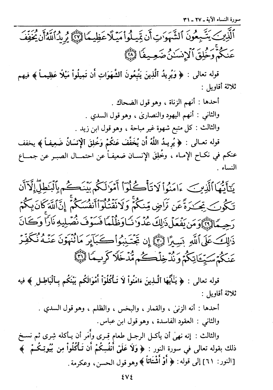 {يا أيها الذين آمنوا لا تأكلوا أموالكم بينكم بالباطل إلا أن تكون تجارة عن تراض منكم ولا تقتلوا أنفسكم إن الله كان بكم رحيما ومن يفعل ذلك عدوانا وظلما فسوف نصليه نارا وكان ذلك على الله يسيرا إن تجتنبوا كبائر ما تنهون عنه نكفر عنكم سيئاتكم وندخلكم مدخلا كريما} قوله تعالى: {يَاأَيُّهَا الَّذِينَءَامَنُواْ لاَ تِأْكُلُواْ أَمْوَالَكُم بَيْنَكُم بِالْبَاطِلِ} فيه ثلاثة أقاويل: أحدها: أنه الزنى , والقمار , والبخس , والظلم , وهو قول السدي. والثاني: العقود الفاسدة , وهو قول ابن عباس. والثالث: أنه نهى أن يأكل الرجل طعام قِرى وأَمَر أن يأكله شِرى ثم نسخ ذلك بقوله تعالى في سورة النور: {وَلاَ عَلَى أَنفُسِكُمْ أَن تَأْكُلُواْ مِن بُيُوتِكُمْ} [النور: 61] إلى قوله: {أَوْ أَشْتَاتاً} وهو قول الحسن , وعكرمة.