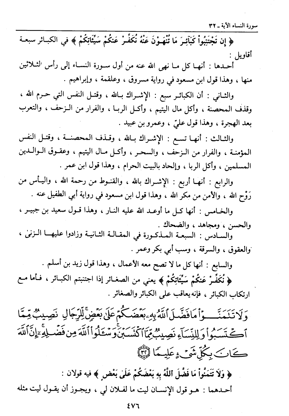 {إِن تَجْتَنِبُواْ كَبَآئِرَ مَا تُنْهَوْنَ عَنْهُ نُكَفِّرْ عَنكُمْ سَيِّئَاتِكُمْ} في الكبائر سبعة أقاويل: أحدها: أنها كل ما نهى الله عنه من أول سورة النساء إلى رأس الثلاثين منها , وهذا قول ابن مسعود في رواية مسروق , وعلقمة , وإبراهيم. والثاني: أن الكبائر سبع: الإشراك بالله , وقتل النفس التي حرم الله , وقذف المحصنة , وأكل مال اليتيم , وأكل الربا , والفرار من الزحف , والتعرب بعد الهجرة , وهذا قول عليّ , وعمرو بن عبيد. والثالث: أنها تسع: الإشراك بالله , وقذف المحصنة , وقتل النفس المؤمنة , والفرار من الزحف , والسحر , وأكل مال اليتيم , وعقوق الوالدين المسلمين , وأكل الربا , وإلحاد بالبيت الحرام , وهذا قول ابن عمر. والرابع: أنها أربع: الإشراك بالله , والقنوط من رحمة الله , واليأس من رَوْح الله , والأمن من مكر الله , وهذا قول ابن مسعود في رواية أبي الطفيل عنه. والخامس: أنها كل ما أوعد الله عليه النار , وهذا قول سعيد بن جبير , والحسن , ومجاهد , والضحاك. والسادس: السبعة المذكورة في المقالة الثانية وزادوا عليها الزنى , والعقوق , والسرقة , وسب أبي بكر وعمر. والسابع: أنها كل ما لا تصح معه الأعمال , وهذا قول زيد بن أسلم. {نُكَفِّرْ عَنكُمْ سَيِّئَاتِكُمْ} يعني من الصغائر إذا اجتنبتم الكبائر , فأما مع ارتكاب الكبائر , فإنه يعاقب على الكبائر والصغائر.