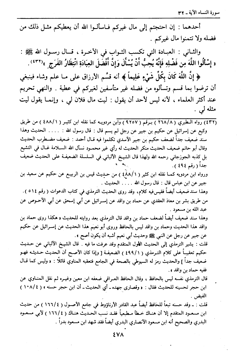 أحدهما: إن احتجتم إلى مال غيركم فاسألوا الله أن يعطيكم مثل ذلك من فضله ولا تتمنوا مال غيركم. والثاني: العبادة التي تكتسب الثواب في الآخرة، قال رسول الله صلى الله عليه وسلم: " إسألوا الله من فضله فإنه يحب أن يسأل وإن أفضل العبادة انتظار الفرج ". {إن الله كان بكل شيء عليماً} أنه قسم الأرزاق على ما علم وشاء فينبغي أن ترضوا بما قسم وتسألوه من فضله غير متأسفين لغيركم في عطية. والنهي تحريم عند أكثر العلماء، لأنه ليس لأحد أن يقول: ليت مال فلان مالي، وإنما يقول ليت مثله لي.