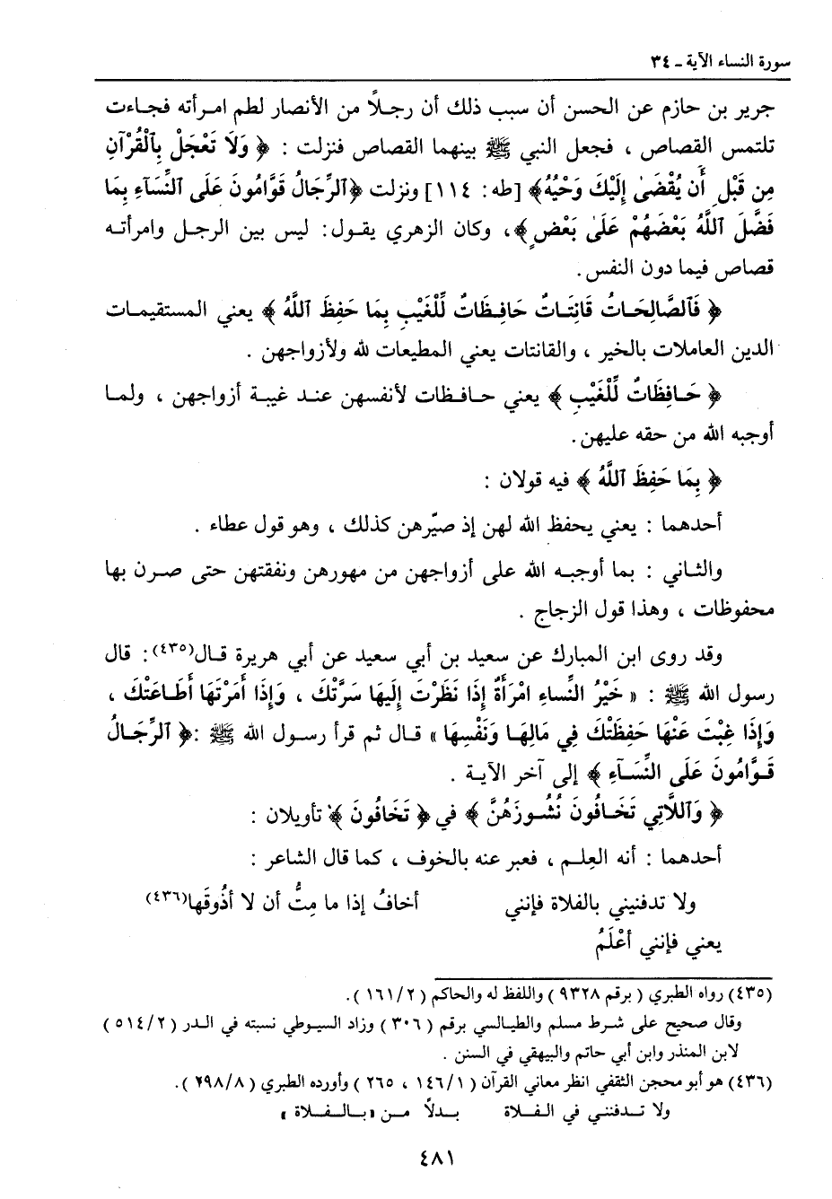 جرير بن حازم عن الحسن أن سبب ذلك أن رجلاً من الأنصار لطم امرأته فجاءت تلتمس القصاص , فجعل النبي صلى الله عليه وسلم بينهما القصاص فنزلت: {وَلاَ تَعْجَلْ بِالْقُرْآنِ مِن قَبْلِ أَن يُقْضَي إِلَيْكَ وَحْيُهُ} [طه: 114] ونزلت {الرِّجَالُ قَوَّامُونَ عَلَى النِّسَآءِ بِمَا فَضَّلَ اللهُ بَعْضَهُمْ عَلَى بَعْضٍ} , وكان الزهري يقول: ليس بين الرجل وامرأته قصاص فيما دون النفس. {فَالصَّالِحَاتُ قَانِتاتٌ حَافِظَاتٌ لِّلْغَيْبِ بِمَا حَفِظَ اللهُ} يعني المستقيمات الدين العاملات بالخير , والقانتات يعني المطيعات لله ولأزواجهن. {حَافِظَاتٌ لِّلْغَيْبِ} يعني حافظات لأنفسهن عند غيبة أزواجهن , ولما أوجبه الله من حقه عليهن. {بِمَا حَفِظَ اللهُ} فيه قولان: أحدهما: يعني يحفظ الله لهن إذ صيّرهن كذلك , وهو قول عطاء. والثاني: بما أوجبه الله على أزواجهن من مهورهن ونفقتهن حتى صرن بها محفوظات , وهذا قول الزجاج. وقد روى ابن المبارك , سعيد بن أبي سعيد أبي هريرة قال: قال رسول الله صلى الله عليه وسلم: (خَيْرُ النَّساءِ امْرَأَةً إِذا نَظَرْتَ إِلَيهَا سَرَّتْكَ , وَإِذَا أَمَرْتَهَا أَطَاعَتْكَ , وَإِذَا غِبْتَ عَنْهَا حَفِظَتْكَ في مالِهَا ونَفْسِهَا) قال ثم قرأ رسول الله صلى الله عليه وسلم: {الرِّجَالُ قَوَّامُونَ عَلَى النِّسَآءِ} إلى آخر الآية. {وَاللاَّتِي تَخَافُونَ نُشُوزَهُنَّ} في {تَخَافُونَ} تأويلان: أحدهما: أنه العلم , فعبر عنه بالخوف , كما قال الشاعر:
