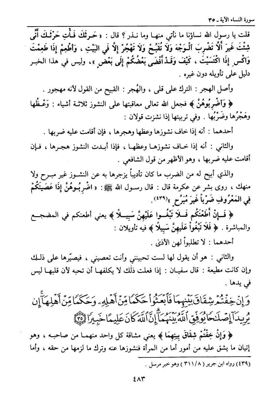قلت يا رسول الله نساؤنا ما نأتي منها وما نذر؟ قال: (حَرثَكَ فَأْتِ حَرْثَكَ أَنَّى شِئْتَ غَيرَ أَلاَّ تَضْرِبَ آلْوَجْهَ وَلاَ تُقَبِّحْ إلاَّ في البًيْتِ , وأطْعِمْ إِذا طَعِمْتَ وَاكْسِ إِذّا اكْتَسَيْتَ , كَيْفَ وَقْدْ أَفْضَى بَعْضُكُمْ إِلَى بَعْضٍ) وليس في هذا الخبر دليل على تأويله دون غيره. وأصل الهجر: الترك على قلى , والهُجر: القبيح من القول لأنه مهجور. {وَآضْرِبُوهُنَّ} فجعل الله تعالى معاقبتها على النشوز ثلاثة أشياء: وَعْظُها وهَجْرُها وضَرْبُها. وفي ترتبيها إذا نشزت قولان: أحدهما: أنه إذا خاف نشوزها وعظها وهجرها , فإن أقامت عليه ضربها. والثاني: أنه إذا خاف نشوزها وعظها , فإذا أبدت المشوز هجرها , فإن أقامت عليه ضربها , وهو الأظهر من قول الشافعي. والذي أبيح له من الضرب ما كان تأديباً يزجرها به عن النشوز غير مبرح ولا منهك , روى بشر عن عكرمة قال: قال رسول الله صلى الله عليه وسلم: (اضْرِبُوهُنَّ إِذَا عَصَينَكُمْ فِي المَعْرُوفِ ضَرْباً غير مُبَرِّحٍ). {فَإِن أَطَعْنَكُم فَلاَ تَبْغُوا عَلَيْهِنَّ سَبِيلاً} يعني أطعنكم في المضجع والمباشرة. {فلا تبغوا عليهن سبيلاً} فيه تأويلان: أحدهما: لا تطلبواْ لهن الأذى. والثاني: هو أن يقول لها لست تحبينني وأنت تعصيني , فيصيّرها على ذلك وإن كانت مطيعة: قال سفيان: إذا فعلت ذلك لا يكلفها أن تحبه لأن قلبها ليس في يدها.