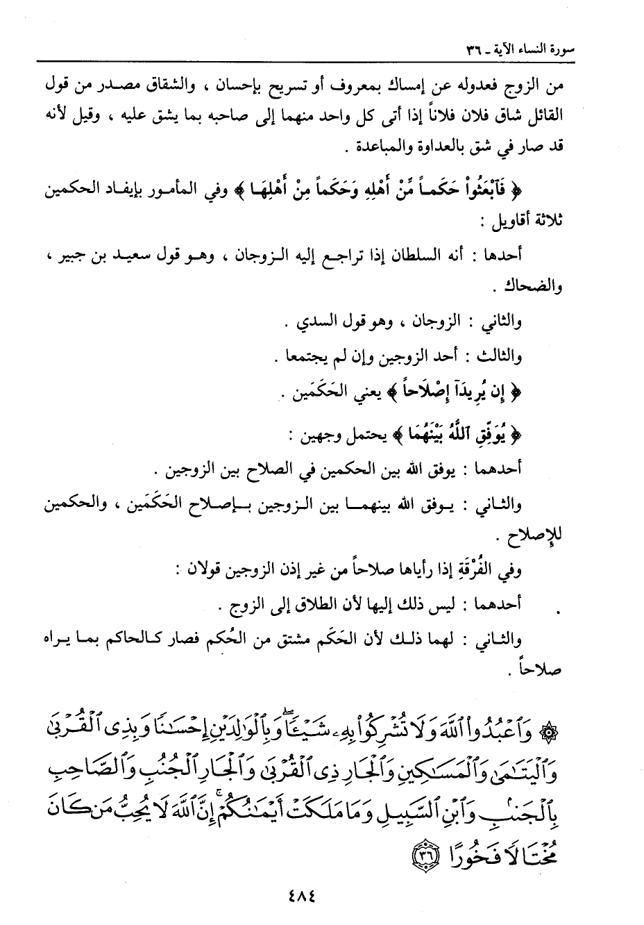 من الزوج فعدوله عن إمساك بمعروف أو تسريح بإحسان , والشقاق مصدر من قول القائل شاق فلان فلاناً إذا أتى كل واحد منهما إلى صاحبه بما يشق عليه , وقيل لأنه قد صار في شق بالعداوة والمباعدة. {فَابْعَثْواْ حَكَماً مِّنْ أَهْلِهِ وَحَكَماً مِنْ أَهْلِهَا} وفي المأمور بإيفاد الحكمين ثلاثة أقاويل: أحدها: أنه السلطان إذا تراجع إليه الزوجان , وهو قول سعيد بن جبير , والضحاك. والثاني: الزوجان , وهو قول السدي. والثالث: أحد الزوجين وإن لم يجتمعا. {إِن يُرِيدَآ إِصْلاَحاً} يعني الحَكَمَين. {يُوَفِقِ اللهُ بَيْنَهُمَا} يحتمل وجهين: أحدهما: يوفق الله بين الحكمين في الصلاح بين الزوجين. والثاني: يوفق الله بينهما بين الزوجين بإصلاح الحَكَمَين , والحكمين للإصلاح. وفي الفُرْقَةِ إذا رأياها صلاحاً من غير إذن الزوجين قولان: أحدهما: ليس ذلك إليها لأن الطلاق إلى الزوج. والثاني: لهما ذلك لأن الحَكَم مشتق من الحُكم فصار كالحاكم بما يراه صلاحاً.