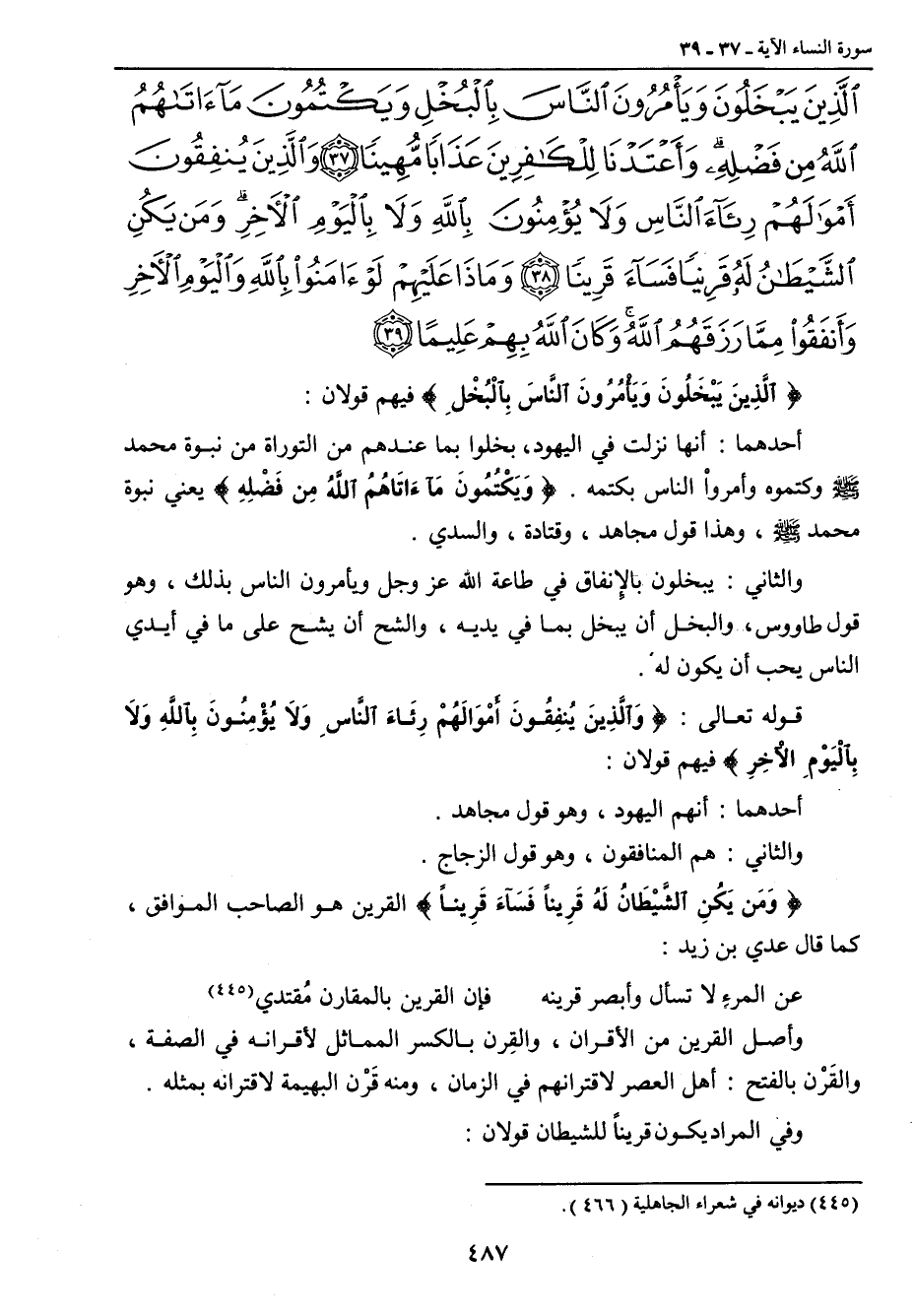 {الذين يبخلون ويأمرون الناس بالبخل ويكتمون ما آتاهم الله من فضله وأعتدنا للكافرين عذابا مهينا والذين ينفقون أموالهم رئاء الناس ولا يؤمنون بالله ولا باليوم الآخر ومن يكن الشيطان له قرينا فساء قرينا وماذا عليهم لو آمنوا بالله واليوم الآخر وأنفقوا من ما رزقهم الله وكان الله بهم عليما} {الَّذِينَ يَبْخَلُونَ وَيَأْمُرُونَ النَّاسَ بِالْبُخْلِ} فيهم قولان: أحدهما: أنها نزلت في اليهود , بخلوا بما عندهم من التوراة من نبوة محمد صلى الله عليه وسلم وكتموه وأمرواْ الناس بكتمه. {وَيَكْتُمُونَ مَآءَاتَاهُمُ اللهُ مِن فَضْلِهِ} يعني نبوة محمد صلى الله عليه وسلم , وهذا قول مجاهد , وقتادة , والسدي. والثاني: يبخلون بالإنفاق في طاعة الله عز وجل ويأمرون الناس بذلك , وهو قول طاووس , والبخل أن يبخل بما في يديه , والشح أن يشح على ما في أيدي الناس يحب أن يكون له. قوله تعالى: {وَالَّذِينَ يُنفِقُونَ أَمْوَالَهُمْ رِئَاءَ النَّاسِ وَلاَ يُؤْمِنُونَ بِاللهِ وَلاَ بِالْيَوْمِ الآْخِرِ} فيهم قولان: أحدهما: أنهم اليهود , وهو قول مجاهد. والثاني: هم المنافقون , وهو قول الزجاج. {وَمَن يَكُنِ الشَّيْطَانُ لَهُ قَرِيناً فَسَآءَ قَرِيناً} القرين هو الصاحب الموافق , كما قال عدي بن زيد:
