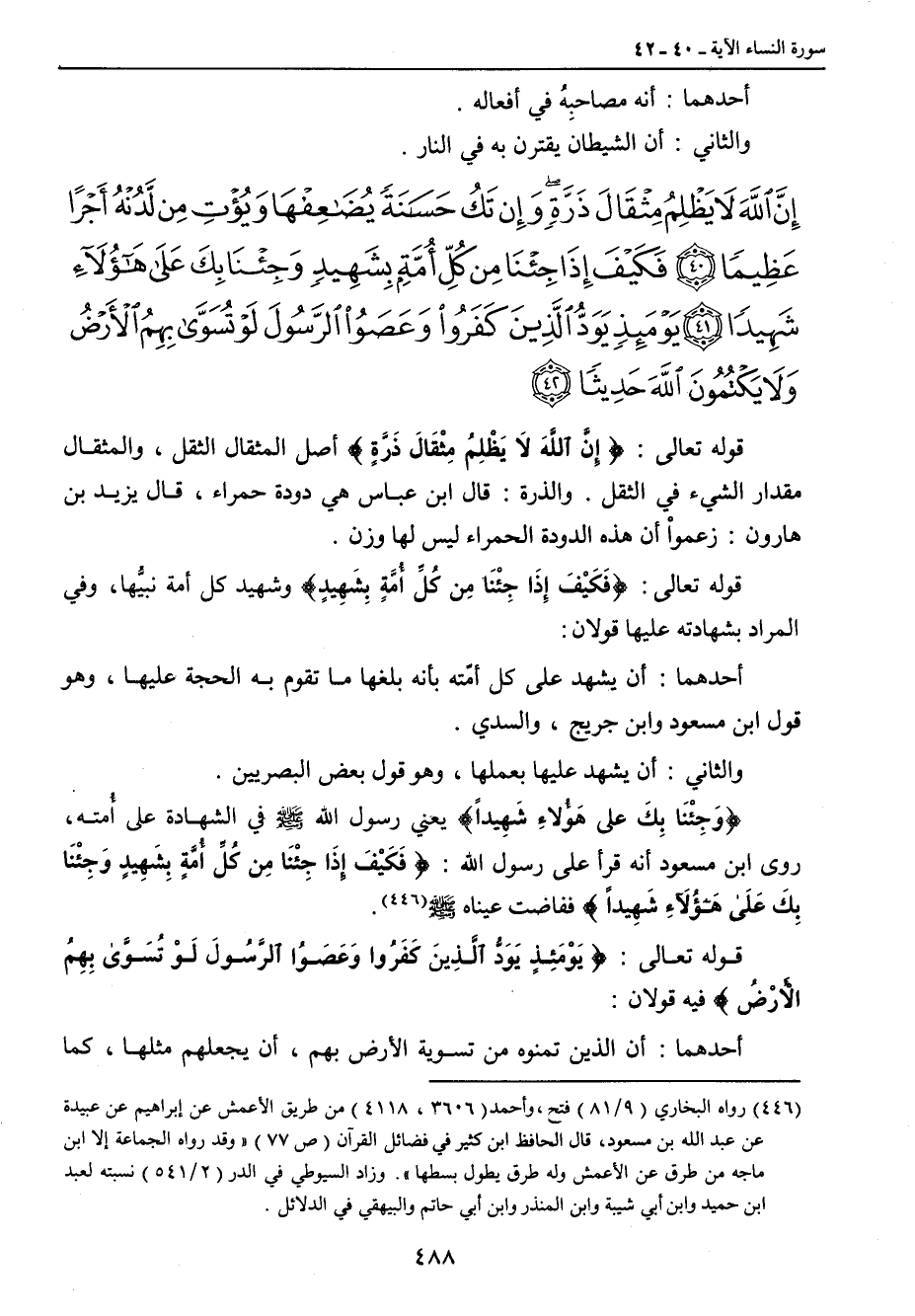 {إن الله لا يظلم مثقال ذرة وإن تك حسنة يضاعفها ويؤت من لدنه أجرا عظيما فكيف إذا جئنا من كل أمة بشهيد وجئنا بك على هؤلاء شهيدا يومئذ يود الذين كفروا وعصوا الرسول لو تسوى بهم الأرض ولا يكتمون الله حديثا} قوله تعالى: {إِنَّ اللهَ لاَ يَظْلِمُ مِثْقَالَ ذَرَّةٍ} أصل المثقال الثقل , والمثقال مقدار الشيء في الثقل. والذرة: قال ابن عباس هي دودة حمراء , قال يزيد بن هارون: زعمواْ أن هذه الدودة الحمراء ليس لها وزن. قوله تعالى: {فَكَيْفَ إِذَا جِئْنَا مِن كُلِّ أُمَّةٍ بِشَهِيدٍ} وشهيد كل أمة نبيُّها , وفي المراد بشهادته عليها قولان: أحدهما: أن يشهد على كل أمّته بأنه بلغها ما تقوم به الحجة عليها , وهو قول ابن مسعود وابن جريج , والسدي. والثاني: أن يشهد عليها بعملها , وهو قول بعض البصريين. {وَجِئْنَا بِكَ على هَؤُلاءِ شَهِيداً} يعني رسول الله صلى الله عليه وسلم في الشهادة على أُمته , روى ابن مسعود أنه قرأ على رسول الله: {فَكَيْفَ إِذَا جِئْنَا مِن كُلِّ أُمَّةٍ بِشَهِيدٍ وَجِئْنَا بِكَ على هَؤُلاءِ شَهِيداً} ففاضت عيناه صلى الله عليه وسلم. قوله تعالى: {يَوْمَئِذٍ يَوَدُّ الَّذِينَ كَفَرُوا وَعَصَوُا الرَّسُولَ لَوْ تُسَوَّى بِهِمُ الأَرْضُ} فيه قولان: أحدهما: أن الذين تمنوه من تسوية الأرض بهم , أن يجعلهم مثلها , كما