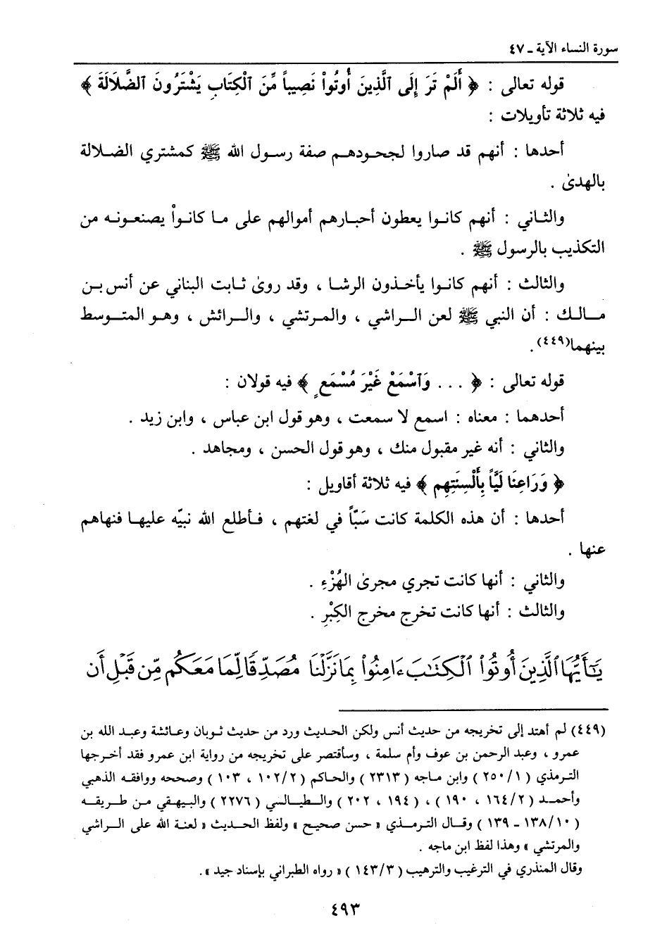 قوله تعالى: {أَلَمْ تَرَ إِلَى الَّذِينَ أُوتُواْ نَصِيباً مِّنَ الْكِتَابِ يَشْتَرُونَ الضَّلاَلَةَ} فيه ثلاثة تأويلات: أحدها: أنهم قد صاروا لجحودهم صفة رسول الله صلى الله عليه وسلم كمشتري الضلالة بالهدى. والثاني: أنهم كانوا يعطون أحبارهم أموالهم على ما كانواْ يصنعونه من التكذيب بالرسول صلى الله عليه وسلم. والثالث: أنهم كانوا يأخذون الرشا , وقد روى ثابت البناني عن أنس بن مالك: أن النبي صلى الله عليه وسلم لعن الراشي , والمرتشي , والرائش , وهو المتوسط بينهما. قوله تعالى: {وَاسْمَعَ غَيْرَ مُسْمَعٍ} فيه قولان: إحداهما: معناه: اسمع لا سمعت , وهو قول ابن عباس , وابن زيد. والثاني: أنه غير مقبول منك , وهو قول الحسن , ومجاهد. {وَرَاعِنَا لَيَّاً بِأَلْسِنَتِهِم} فيه ثلاثة أقاويل: أحدها: أن هذه الكلمة كانت سَبّاً في لغتهم , فأطلع الله نبيّه عليها فنهاهم عنها. والثاني: أنها كانت تجري مجرى الهُزْءِ. والثالث: إنها كانت تخرج مخرج الكِبْر.