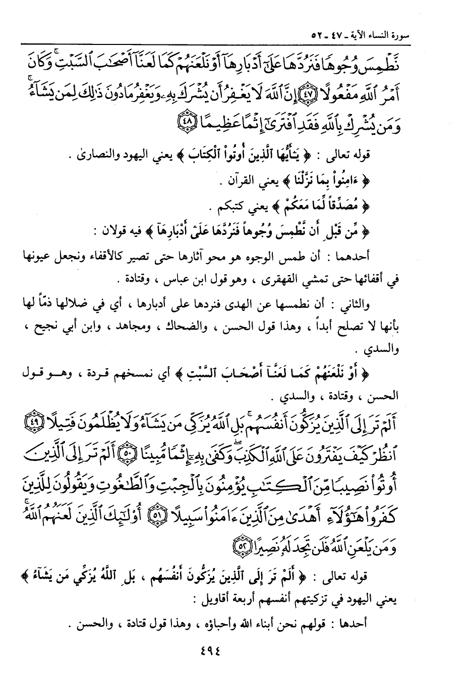 نطمس وجوها فنردها على أدبارها أو نلعنهم كما لعنا أصحاب السبت وكان أمر الله مفعولا إن الله لا يغفر أن يشرك به ويغفر ما دون ذلك لمن يشاء ومن يشرك بالله فقد افترى إثما عظيما} قوله تعالى: {يَاأَيُّهَا الَّذِينَ أُوتُواْ الْكِتَابَ} يعني اليهود والنصارى. {ءَامِنُواْ بِمَا نَزَّلْنَا} يعني القرآن. {مُصَدِّقاً لِّمَا مَعَكُمْ} يعني كتبكم. {مِّن قَبْلِ أَن نِّطْمِسَ وُجُوهاً فَنَرُدَّهَا عَلَى أَدْبَارِهآ} فيه قولان: أحدهما: أن طمس الوجوه هو محو آثارها حتى تصير كالأقفاء ونجعل عيونها في أقفائها حتى تمشي القهقرى , وهو قول ابن عباس , وقتادة. والثاني: أن نطمسها عن الهدى فنردها على أدبارها , أي في ضلالها ذمّاً لها بأنها لا تصلح أبداً , وهذا قول الحسن , والضحاك , ومجاهد , وابن أبي نجيح , والسدي. {أَوْ نَلْعَنَهُمْ كَمَا لَعَنَّآ أَصْحَابَ السَّبْتِ} أي نمسخهم قردة , وهو قول الحسن , وقتادة , والسدي.