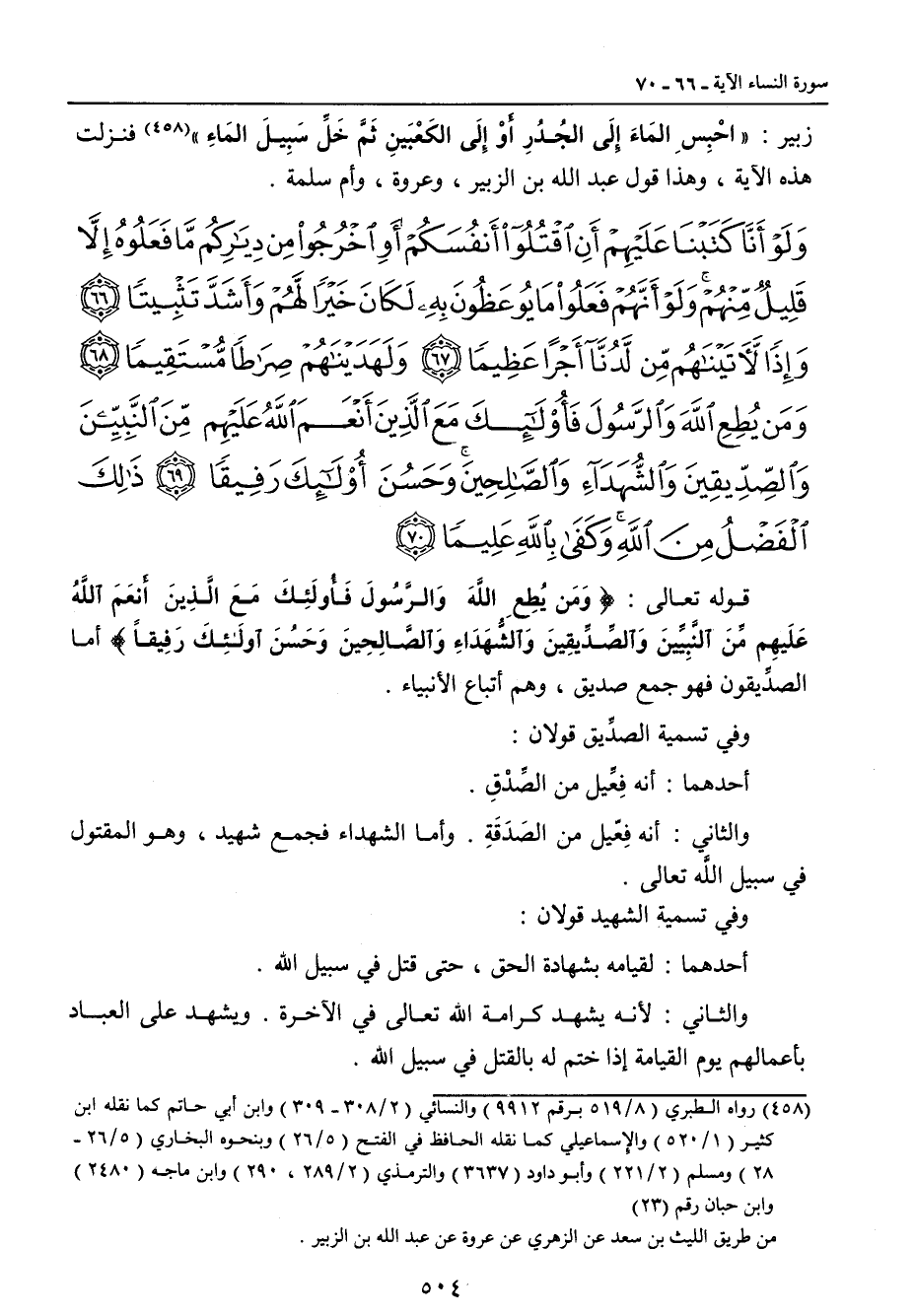 {ولو أنا كتبنا عليهم أن اقتلوا أنفسكم أو اخرجوا من دياركم ما فعلوه إلا قليل منهم ولو أنهم فعلوا ما يوعظون به لكان خيرا لهم وأشد تثبيتا وإذا لآتيناهم من لدنا أجرا عظيما ولهديناهم صراطا مستقيما ومن يطع الله والرسول فأولئك مع الذين أنعم الله عليهم من النبيين والصديقين والشهداء والصالحين وحسن أولئك رفيقا ذلك الفضل من الله وكفى بالله عليما} قوله تعالى: {وَمَن يُطِعِ اللهَ وَالرَّسُولَ فَأُولَئِكَ مَعَ الَّذِينَ أَنعَمَ اللهُ عَلَيهِم مِّنَ النَّبِيِّينَ وَالصِّدِّيقِينَ والشُّهَدَاءِ وَالصَّالِحِينَ وَحَسُنَ اولَئِكَ رَفِيقاً} أما الصديقون فهو جمع صديق , وهم أتباع الأنبياء. وفي تسمية الصديق قولان: أحدهما: أنه فِعِّيل من الصِّدْقِ. والثاني: أنه فِعّيل من الصَدَقَة. وأما الشهداء فجمع شهيد , وهو المقتول في سبيل اللَّه تعالى. وفي تسمية الشهيد قولان: أحدهما: لقيامه بشهادة الحق , حتى قتل في سبيل الله.