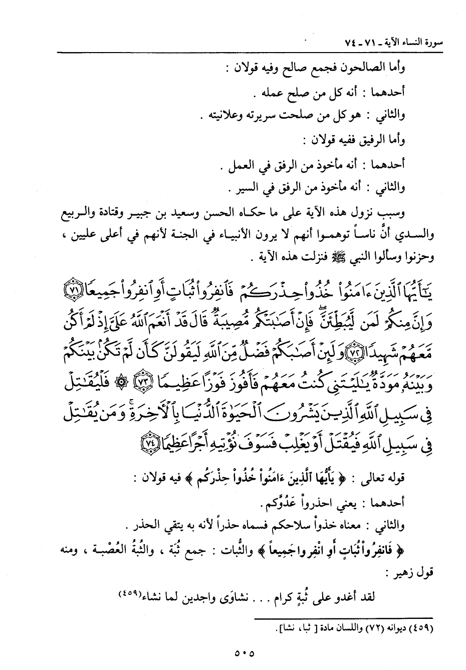{يا أيها الذين آمنوا خذوا حذركم فانفروا ثبات أو انفروا جميعا وإن منكم لمن ليبطئن فإن أصابتكم مصيبة قال قد أنعم الله علي إذ لم أكن معهم شهيدا ولئن أصابكم فضل من الله ليقولن كأن لم تكن بينكم وبينه مودة يا ليتني كنت معهم فأفوز فوزا عظيما فليقاتل في سبيل الله الذين يشرون الحياة الدنيا بالآخرة ومن يقاتل في سبيل الله فيقتل أو يغلب فسوف نؤتيه أجرا عظيما} قوله تعالى: {يَا أَيُّهَا الَّذِينَءَامَنُواْ خُذُواْ حِذْرَكُم} فيه قولان: أحدهما: يعني احذرواْ عَدُوَّكم. والثاني: معناه خذواْ سلاحكم فسماه حذراً لأنه به يتقي الحذر. {فَانفِرُواْ ثُبَاتٍ أَوِ انْفِرو جَمِيعاً} والثُّبات: جمع ثُبة , والثُبةُ العُصْبة , ومنه قول زهير: