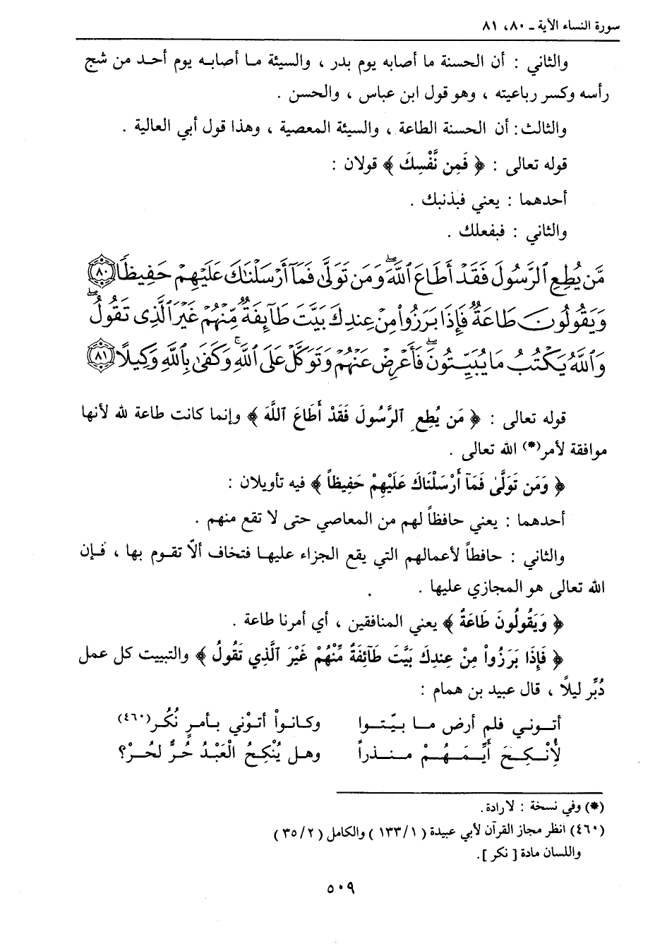 {من يطع الرسول فقد أطاع الله ومن تولى فما أرسلناك عليهم حفيظا ويقولون طاعة فإذا برزوا من عندك بيت طائفة منهم غير الذي تقول والله يكتب ما يبيتون فأعرض عنهم وتوكل على الله وكفى بالله وكيلا} قوله تعالى: {مَن يُطِعِ الرَّسُولَ فَقَدْ أَطَاعَ اللهَ} وإنما كانت طاعة لله لأنها موافقة لأمر الله تعالى. {وَمَن تَوَلَّى فَمَآ أَرْسَلْنَاكَ عَلَيْهِمْ حَفِيظاً} فيه تأويلان: أحدهما: يعني حافظاً لهم من المعاصي حتى لا تقع منهم. والثاني: حافظاً لأعمالهم التي يقع الجزاء عليها فتخاف ألاّ تقوم بها , فإن الله تعالى هو المجازي عليها. {وَيَقُولُونَ طَاعَةٌ} يعني المنافقين , أي أمرنا طاعة. {فَإِذَا بَرَزُواْ مِنْ عِندِكَ بَيَّتَ طَآئِفَةٌ مِّنْهُمْ غَيْرَ الَّذِي تَقُولُ} والتبييت كل عمل دُبِّر ليلاً , قال عبيد بن همام: