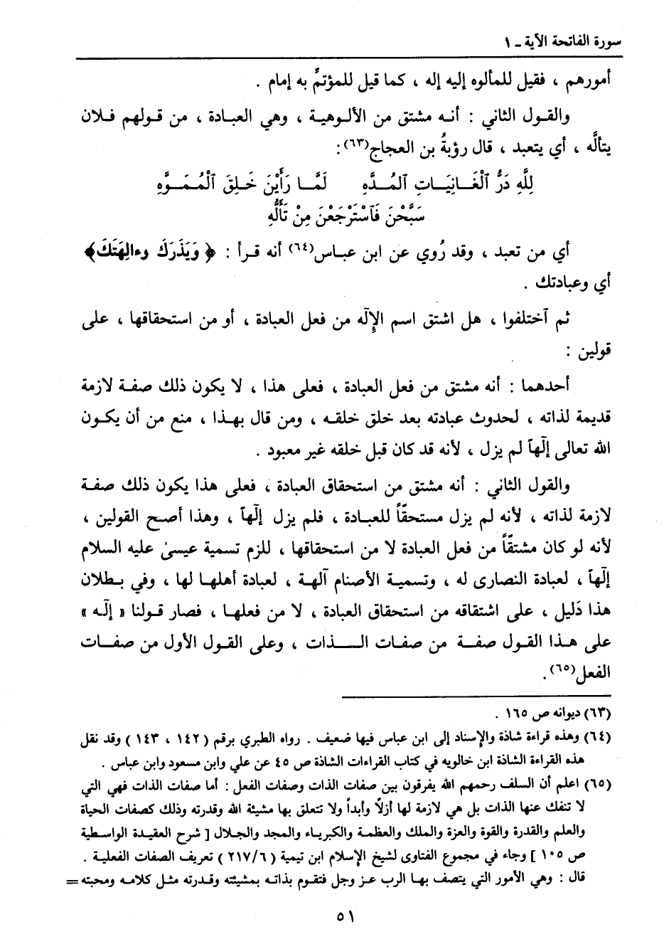 أي من تعبد , وقد رُوي عن ابن عباس أنه قرأ: {وَيَذَرَكَ وءالِهَتَكَ} أي وعبادتك. ثم اختلفوا , هل اشتق اسم الإله من فعل العبادة , أو من استحقاقها , على قولين: أحدهما: أنه مشتق من فعل العبادة , فعلى هذا , لا يكون ذلك صفة لازمة قديمة لذاته , لحدوث عبادته بعد خلق خلقه , ومن قال بهذا , منع من أن يكون الله تعالى إلهاً لم يزل , لأنه قد كان قبل خلقه غير معبود. والقول الثاني: أنه مشتق من استحقاق العبادة , فعلى هذا يكون ذلك صفة لازمة لذاته , لأنه لم يزل مستحقّاً للعبادة , فلم يزل إلهاً , وهذا أصح القولين , لأنه لو كان مشتقّاً من فعل العبادة لا من استحقاقها , للزم تسمية عيسى عليه السلام إلهاً , لعبادة النصارى له , وتسمية الأصنام آلهة , لعبادة أهلها لها , وفي بطلان هذا دليل , على اشتقاقه من استحقاق العبادة , لا من فعلها , فصار قولنا (إله) على هذا القول صفة من صفات الذات , وعلى القول الأول من صفات الفعل.