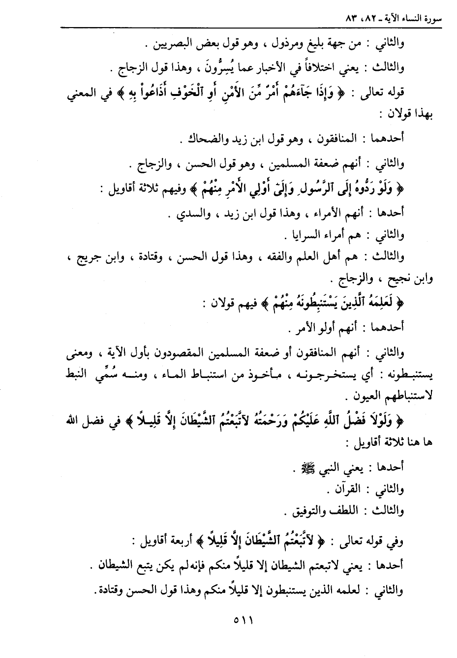 والثاني: من جهة بليغ ومرذول , وهو قول بعض البصريين. والثالث: يعني اختلافاً في الأخبار عما يُسِرُّونَ , وهذا قول الزجاج. قوله تعالى: {وَإِذَا جَآءَهُمْ أَمْرٌ مِّنَ الأمْنِ أَوِ الْخَوْفِ أَذَاعُواْ بِهِ} في المعني بهذا قولان: أحدهما: المنافقون , وهو قول ابن زيد والضحاك. والثاني: أنهم ضعفة المسلمين , وهو قول الحسن , والزجاج. {وَلَوْ رَدُّوهُ إِلَى الرَّسُولِ وَإِلَى أُوْلِي الأَمْرِ مِنْهُمْ} وفيهم ثلاثة أقاويل: أحدها: أنهم الأمراء , وهذا قول ابن زيد , والسدي. والثاني: هم أمراء السرايا. والثالث: هم أهل العلم والفقه , وهذا قول الحسن , وقتادة , وابن جريج , وابن نجيح , والزجاج. {لَعَلِمَهُ الَّذِينَ يَسْتَنبِطُونَهُ مِنْهُمْ} فيهم قولان: أحدهما: أنهم أولو الأمر. والثاني: أنهم المنافقون أو ضعفة المسلمين المقصودون بأول الآية , ومعنى يستنبطونه: أي يستخرجونه , مأخوذ من استنباط الماء , ومنه سُمِّي النبط لاستنباطهم العيون. {وَلَوْلاَ فَضْلُ اللهِ عَلَيْكُمْ وَرَحْمَتُهُ لآتَّبَعْتُمُ الشَّيْطَانَ إِلاَّ قَلِيلاً} في فضل الله ها هنا ثلاثة أقاويل: أحدها: يعني النبي صلى الله عليه وسلم. والثاني: القرآن. والثالث: اللطف والتوفيق. وفي قوله تعالى: {لآتَّبَعْتُمُ الشَّيْطَانَ إِلاَّ قَلِيلاً} أربعة أقاويل: أحدها: يعني لاتبعتم الشيطان إلا قليلاً منكم فإنه لم يكن يتبع الشيطان. والثاني: لعلمه الذين يستنبطون إلا قليلاً منكم وهذا قول الحسن وقتادة.