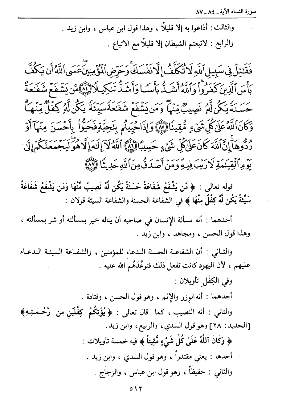 {فقاتل في سبيل الله لا تكلف إلا نفسك وحرض المؤمنين عسى الله أن يكف بأس الذين كفروا والله أشد بأسا وأشد تنكيلا من يشفع شفاعة حسنة يكن له نصيب منها ومن يشفع شفاعة سيئة يكن له كفل منها وكان الله على كل شيء مقيتا وإذا حييتم بتحية فحيوا بأحسن منها أو ردوها إن الله كان على كل شيء حسيبا الله لا إله إلا هو ليجمعنكم إلى يوم القيامة لا ريب فيه ومن أصدق من الله حديثا} قوله تعالى: {مَّن يَشْفَعْ شَفَاعَةً حَسَنَةً يَكُن لَّهُ نَصِيبٌ مِّنْهَا وَمَن يَشْفَعْ شَفَاعَةً سَيِّئةً يَكُن لَّهُ كِفْلٌ مِنْهَا} في الشفاعة الحسنة والشفاعة السيئة قولان: أحدهما: أنه مسألة الإنسان في صاحبه أن يناله خير بمسألته أو شر بمسألته , وهذا قول الحسن , ومجاهد , وابن زيد. والثاني: أن الشفاعة الحسنة الدعاء للمؤمنين , والشفاعة السيئة الدعاء عليهم , لأن اليهود كانت تفعل ذلك فتوعَّدَهُم الله عليه. وفي الكِفْلِ تأويلان: أحدها: أنه الوِزر والإثم , وهو قول الحسن , وقتادة. والثاني: أنه النصيب , كما قال تعالى: {يُؤْتِكُمْ كِفْلَيْنِ مِن رَّحْمَتِهِ} [الحديد: 28] وهو قول السدي , والربيع , وابن زيد. {وَكَانَ اللهُ عَلَى كُلِّ شَيْءٍ مُّقِيتاً} فيه خمسة تأويلات: أحدها: يعني مقتدراً , وهو قول السدي , وابن زيد. والثاني: حفيظاً , وهو قول ابن عباس , والزجاج.