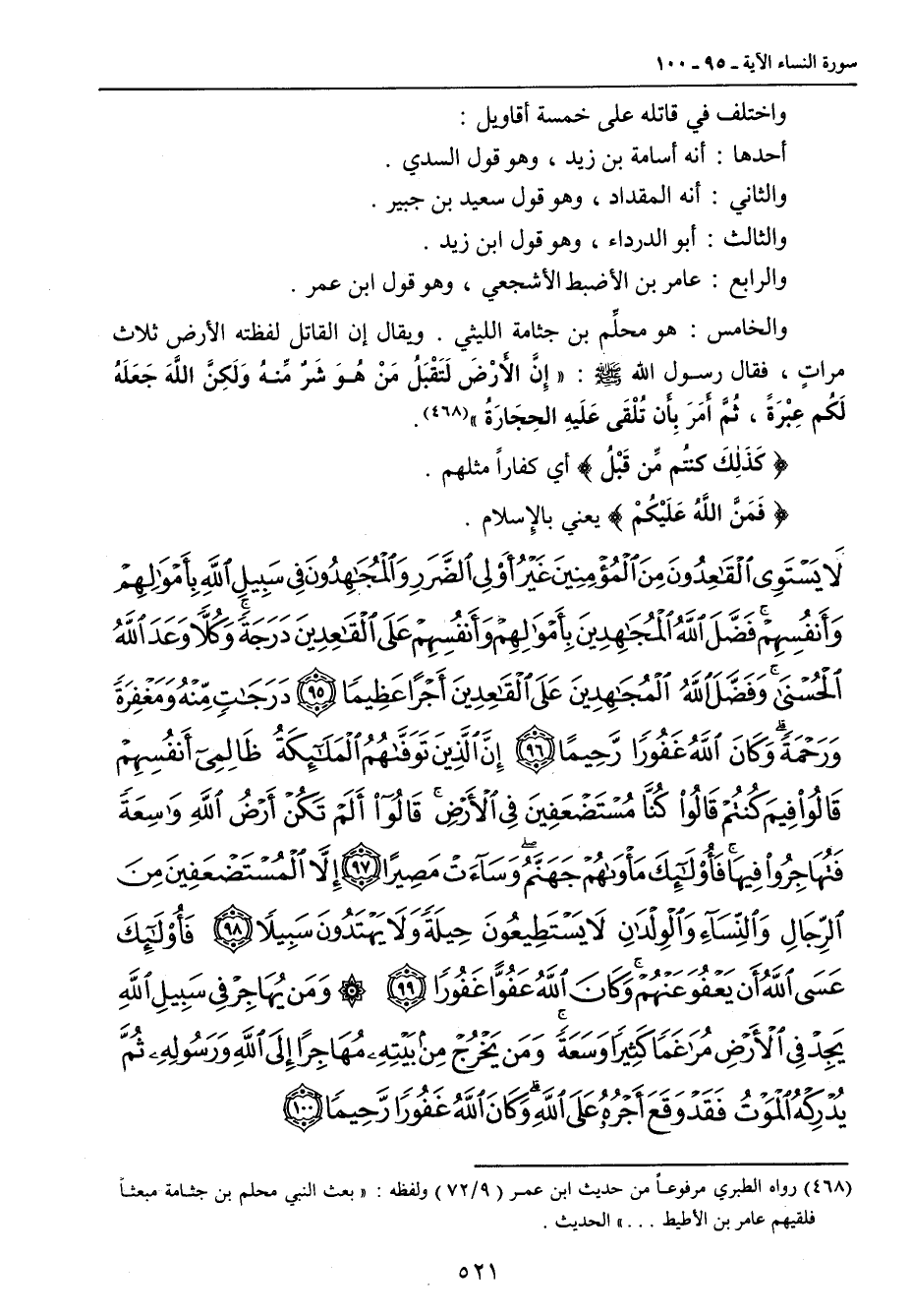 {لا يستوي القاعدون من المؤمنين غير أولي الضرر والمجاهدون في سبيل الله بأموالهم وأنفسهم فضل الله المجاهدين بأموالهم وأنفسهم على القاعدين درجة وكلا وعد الله الحسنى وفضل الله المجاهدين على القاعدين أجرا عظيما درجات منه ومغفرة ورحمة وكان الله غفورا رحيما إن الذين توفاهم الملائكة ظالمي أنفسهم قالوا فيم كنتم قالوا كنا مستضعفين في الأرض قالوا ألم تكن أرض الله واسعة فتهاجروا فيها فأولئك مأواهم جهنم وساءت مصيرا إلا المستضعفين من الرجال والنساء والولدان لا يستطيعون حيلة ولا يهتدون سبيلا فأولئك عسى الله أن يعفو عنهم وكان الله عفوا غفورا ومن يهاجر في سبيل الله يجد في الأرض مراغما كثيرا وسعة ومن يخرج من بيته مهاجرا إلى الله ورسوله ثم يدركه الموت فقد وقع أجره على الله وكان الله غفورا رحيما}