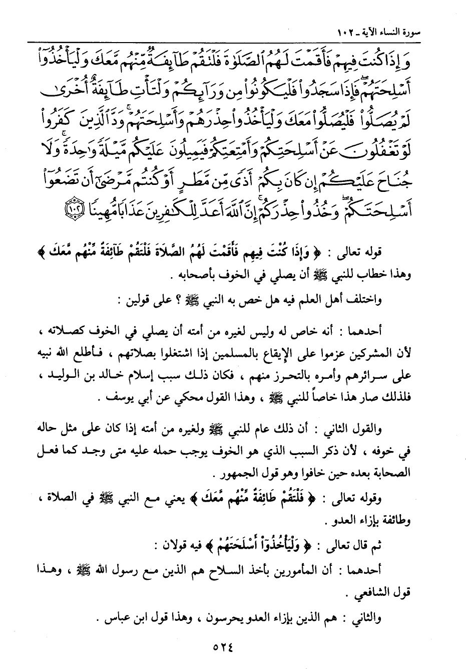 {وإذا كنت فيهم فأقمت لهم الصلاة فلتقم طائفة منهم معك وليأخذوا أسلحتهم فإذا سجدوا فليكونوا من ورائكم ولتأت طائفة أخرى لم يصلوا فليصلوا معك وليأخذوا حذرهم وأسلحتهم ود الذين كفروا لو تغفلون عن أسلحتكم وأمتعتكم فيميلون عليكم ميلة واحدة ولا جناح عليكم إن كان بكم أذى من مطر أو كنتم مرضى أن تضعوا أسلحتكم وخذوا حذركم إن الله أعد للكافرين عذابا مهينا} قوله تعالى: {وَإِذَا كُنْتَ فِيهِم فَأَقَمْتَ لَهُمُ الصَّلاَةَ فَلْتَقُمْ طَآئِفَةٌ مِّنْهُم مَّعَكَ} وهذا خطاب للنبي صلى الله عليه وسلم أن يصلي في الخوف بأصحابه. واختلف أهل العلم فيه هل خص به النبي صلى الله عليه وسلم؟ على قولين: أحدهما: أنه خاص له وليس لغيره من أمته أن يصلي في الخوف كصلاته , لأن المشركين عزموا على الإيقاع بالمسلمين إذا اشتغلوا بصلاتهم , فاطلع الله نبيه على سرائرهم وأمره بالتحرز منهم , فكان ذلك سبب إسلام خالد بن الوليد , فلذلك صار هذا خاصاً للنبي صلى الله عليه وسلم , وهذا القول محكي عن أبي يوسف. والقول الثاني: أن ذلك عام للنبي صلى الله عليه وسلم ولغيره من أمته إذا كان على مثل حاله في خوفه , لأن ذكر السبب الذي هو الخوف يوجب حمله عليه متى وجد كما فعل الصحابة بعده حين خافوا وهو قول الجمهور. وقوله تعالى: {فَلْتَقُمْ طَآئِفَةٌ مِّنْهُم مَّعَكَ} يعني مع النبي صلى الله عليه وسلم في الصلاة , وطائفة بإزاء العدو. ثم قال تعالى: {وَلْيَأْخُذُواْ أَسْلِحَتَهُمْ} فيه قولان: أحدهما: أن المأمورين بأخذ السلاح هم الذين مع رسول الله صلى الله عليه وسلم , وهذا قول الشافعي. والثاني: هم الذين بإزاء العدو يحرسون , وهذا قول ابن عباس.