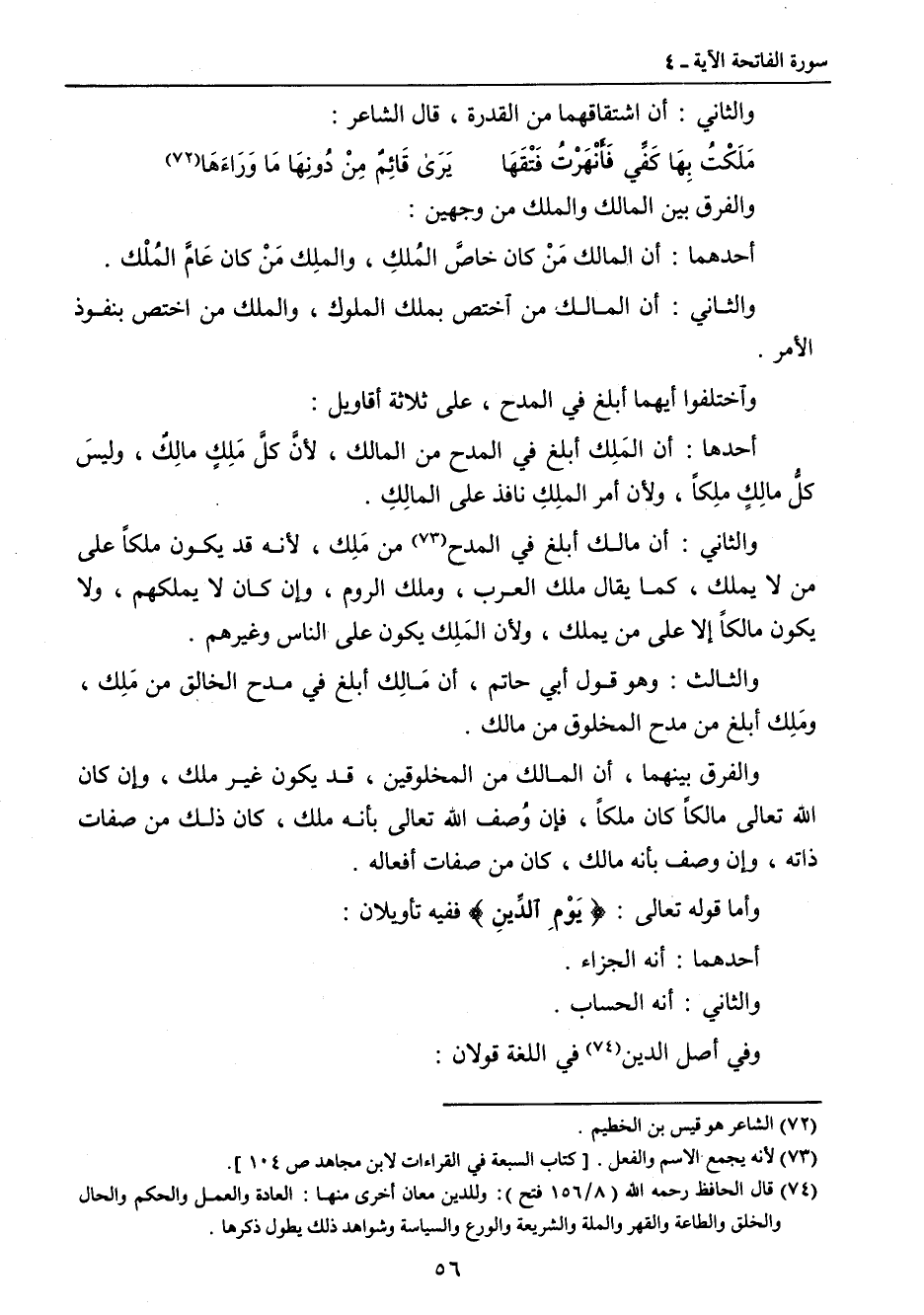 والفرق بين المالك والملك من وجهين: أحدهما: أن المالك مَنْ كان خاصَّ المُلكِ , والملِك مَنْ كان عَامَّ المُلْك. والثاني: أن المالك من اختص بملك الملوك , والملك من اختص بنفوذ الأمر. واختلفوا أيهما أبلغ في المدح , على ثلاثة أقاويل: أحدها: أن المَلِك أبلغ في المدح من المالك , لأنَّ كلَّ مَلِكٍ مالِكٌ , وليسَ كلُّ مالِكٍ ملِكاً , ولأن أمر الملِكِ نافذ على المالِكِ. والثاني: أن مالك أبلغ في المدح من مَلِك , لأنه قد يكون ملكاً على من لا يملك , كما يقال ملك العرب , وملك الروم , وإن كان لا يملكهم , ولا يكون مالكاً إلا على من يملك , ولأن المَلِك يكون على الناس وغيرهم. والثالث: وهو قول أبي حاتم , أن مَالِك أبلغ في مدح الخالق من مَلِك , ومَلِك أبلغ من مدح المخلوق من مالك. والفرق بينهما , أن المالك من المخلوقين , قد يكون غير ملك , وإن كان الله تعالى مالكاً كان ملكاً , فإن وُصف الله تعالى بأنه ملك , كان ذلك من صفات ذاته , وإن وصف بأنه مالك , كان من صفات أفعاله. وأما قوله تعالى: {يَوْمِ الدِّينِ} ففيه تأويلان: أحدهما: أنه الجزاء. والثاني: أنه الحساب. وفي أصل الدين في اللغة قولان:
