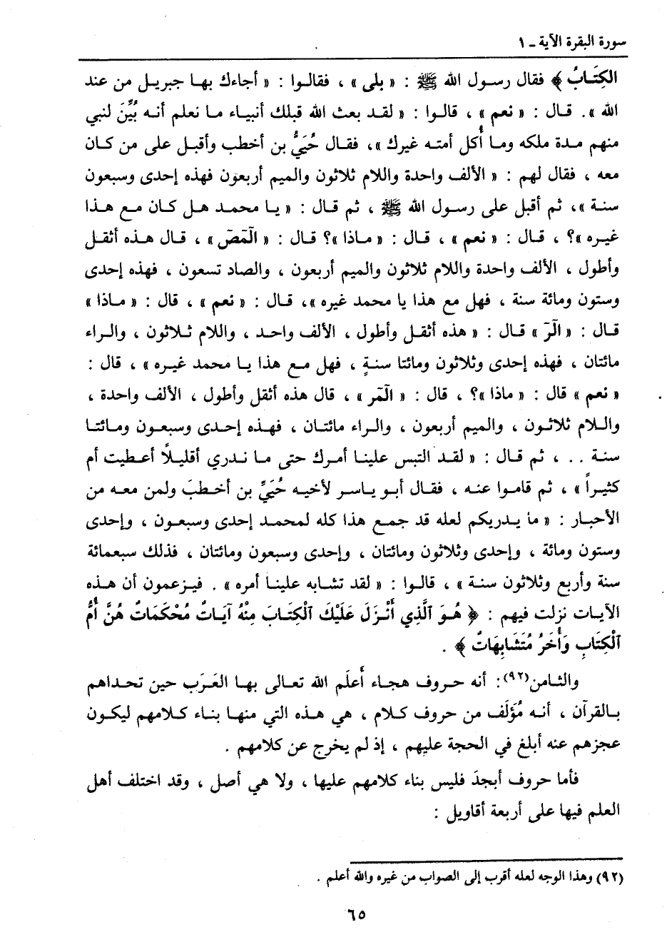 الكِتَابُ} فقال رسول الله صلى الله عليه وسلم: (بلى) , فقالوا: (أجاءك بها جبريل من عند الله). قال: (نعم) , قالوا: (لقد بعث الله قبلك أنبياء ما نعلم أنه بُيِّنَ لنبي منهم مدة ملكه وما أُكل أمته غيرك) , فقال حُيَيُّ بن أخطب وأقبل على من كان معه , فقال لهم: (الألف واحدة واللام ثلاثون والميم أربعون فهذه إحدى وسبعون سنة) , ثم أقبل على رسول الله صلى الله عليه وسلم , ثم قال: (يا محمد هل كان مع هذا غيره)؟ , قال: (نعم) , قال: (ماذا)؟ قال: (المص) , قال هذه أثقل وأطول , الألف واحدة واللام ثلاثون والميم أربعون , والصاد تسعون , فهذه إحدى وستون ومائة سنة , فهل مع هذا يا محمد غيره (, قال:) نعم (, قال:) ماذا (قال:) الر (قال:) هذه أثقل وأطول , الألف واحد , واللام ثلاثون , والراء مائتان , فهذه إحدى وثلاثون ومائتان سنةٍ , فهل مع هذا يا محمد غيره (, قال:) نعم (قال:) ماذا (؟ , قال:) المر (, قال هذه أثقل وأطول , الألف واحدة , واللام ثلاثون , والميم أربعون , والراء مائتان , فهذه إحدى وسبعون ومائتا سنة. . , ثم قال:) لقد التبس علينا أمرك حتى ما ندري أقليلاً أعطيت أم كثيراً (, ثم قاموا عنه , فقال أبو ياسر لأخيه حُيَيَّ بن أخطبَ ولمن معه من الأحبار:) ما يدريكم لعله قد جمع هذا كله لمحمد إحدى وسبعون , وإحدى وستون ومائة , وإحدى وثلاثون ومائتان , وإحدى وسبعون ومائتان , فذلك سبعمائة سنة وأربع وثلاثون سنة (, قالوا:) لقد تشابه علينا أمره (. فيزعمون أن هذه الآيات نزلت فيهم: {هُوَ الَّذي أَنْزَلَ عَلَيْكَ الْكِتَابَ مِنْهُ آيَاتٌ مُحْكَمَاتٌ هُنَّ أُمُّ الْكِتَابِ وَأُخَرُ مُتَشَابِهَاتٌ}. والثامن (92): أنه حروف هجاء أَعلم الله تعالى بها العَرَب حين تحداهم بالقرآن , أنه مُؤلَف من حروف كلام , هي هذه التي منها بناء كلامهم ليكون عجزهم عنه أبلغ في الحجة عليهم , إذ لم يخرج عن كلامهم. فأما حروف أبجدَ فليس بناء كلامهم عليها , ولا هي أصل , وقد اختلف أهل العلم فيها على أربعة أقاويل: