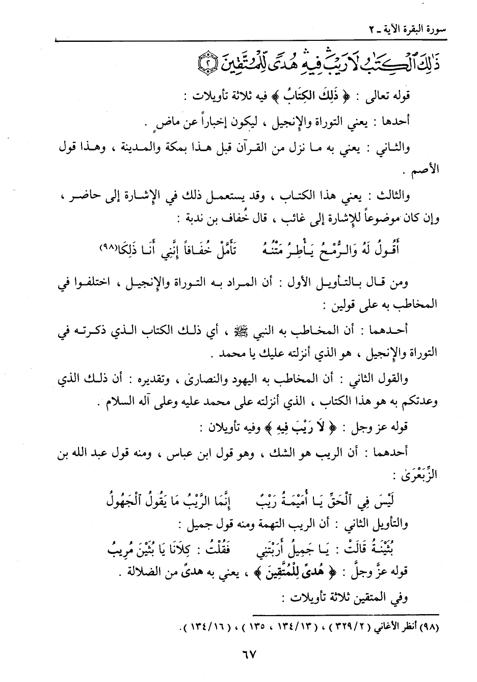 {ذلك الكتاب لا ريب فيه هدى للمتقين} قوله تعالى: {ذَلِكَ الكِتَابُ} فيه ثلاثة تأويلات: أحدها: يعني التوراة والإنجيل , ليكون إخباراً عن ماضٍ. والثاني: يعني به ما نزل من القرآن قبل هذا بمكة والمدينة , وهذا قول الأصم. والثالث: يعني هذا الكتاب , وقد يستعمل ذلك في الإشارة إلى حاضر , وإن كان موضوعاً للإشارة إلى غائب , قال خُفاف بن ندبة: