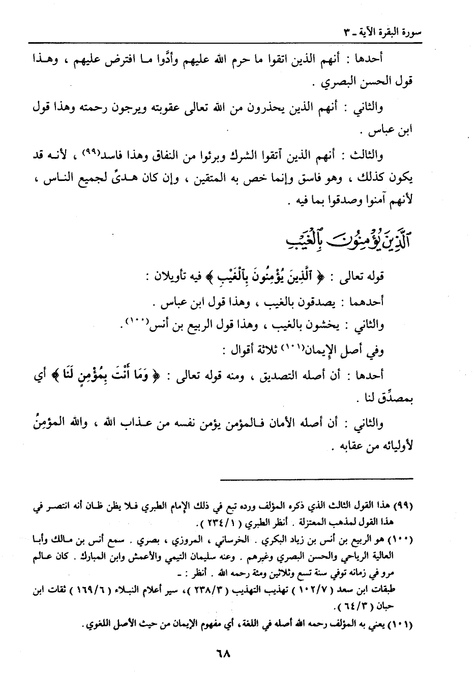 {الذين يؤمنون بالغيب ويقيمون الصلاة ومما رزقناهم ينفقون} {الَّذِينَ يُؤْمِنُونَ بِالغَيْبَ} قوله تعالى: {الَّذِينَ يُؤْمِنُونَ بِالْغَيْبَ} فيه تأويلان: أحدهما: يصدقون بالغيب , وهذا قول ابن عباس. والثاني: يخشون بالغيب , وهذا قول الربيع بن أنس (100). وفي الأصل الإيمان (101) ثلاثة أقوال: أحدها: أن أصله التصديق , ومنه قوله تعالى: {وَمَا أَنْتَ بِمُؤْمِنٍ لَنَا} أي بمصدِّق لنا. والثاني: أن أصله الأمان فالمؤمن يؤمن نفسه من عذاب الله , والله المؤمِنُ لأوليائه من عقابه.