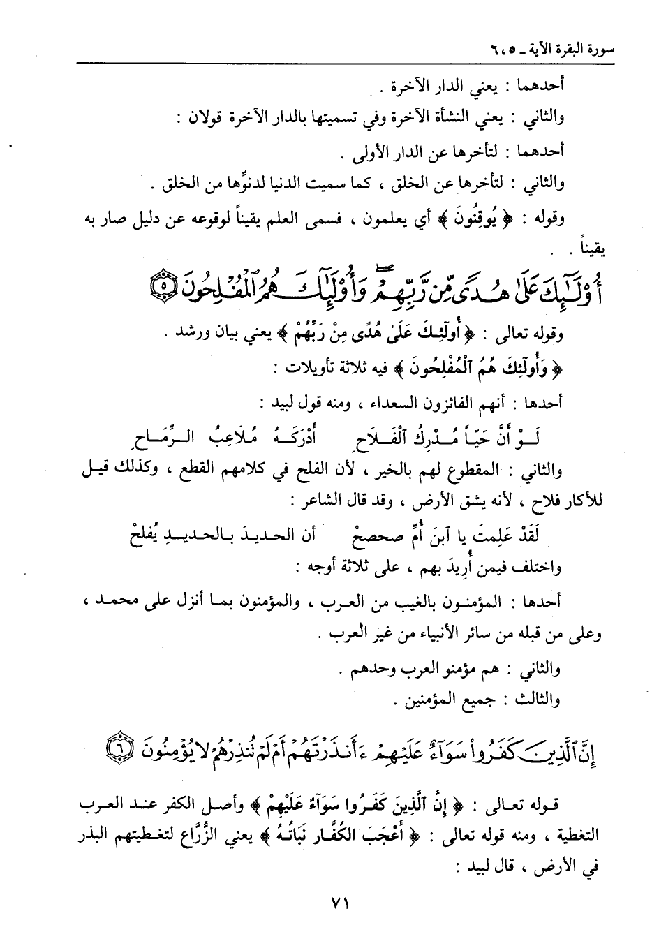 {أولئك على هدى من ربهم وأولئك هم المفلحون} وقوله تعالى: {أُولئِكَ على هُدىً مِنْ رَبِّهُمْ} يعني بيان ورشد. {وَأُولئِكَ هُمُ الْمُفْلِحُونَ} فيه ثلاثة تأويلات: أحدها: أنهم الفائزون السعداء , ومنه قول لبيد: