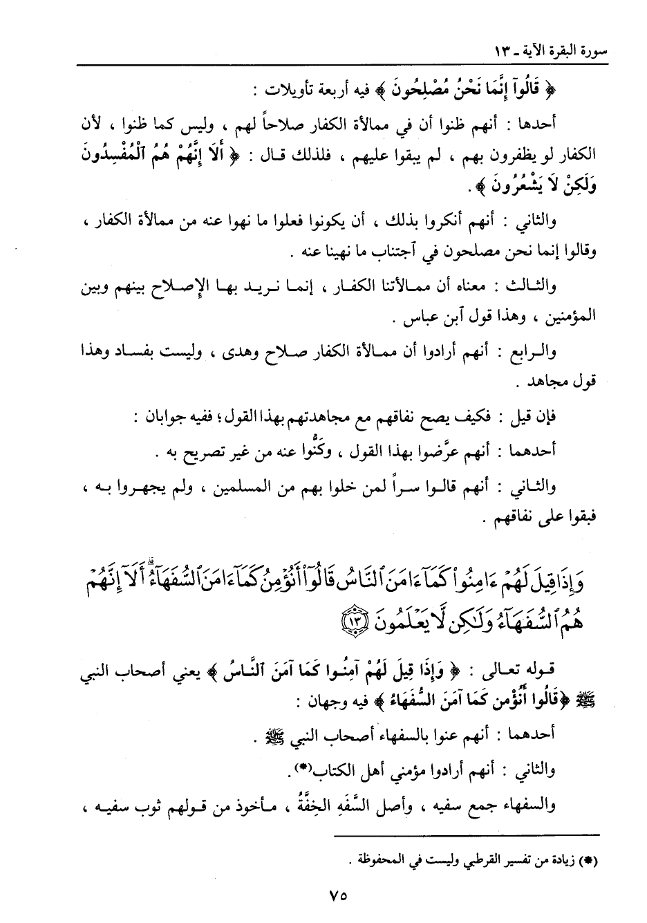 {وإذا قيل لهم آمنوا كما آمن الناس قالوا أنؤمن كما آمن السفهاء ألا إنهم هم السفهاء ولكن لا يعلمون} قوله تعالى: {وإذا قيل لَهُمْ آمِنُوا كَمَا آمَنَ النَّاسُ} يعني أصحاب النبي صلى الله عليه وسلم {قَالُوا أَنُؤْمن كَمَا آمَنَ السُّفَهَاءُ} فيه وجهان: أحدهما: أنهم عنوا بالسفهاء أصحاب النبي صلى الله عليه وسلم. والثاني: أنهم أرادوا مؤمني أهل الكتاب. والسفهاء جمع سفيه , وأصل السَّفَهِ الخِفَّةُ , مأخوذ من قولهم ثوب سفيه ,