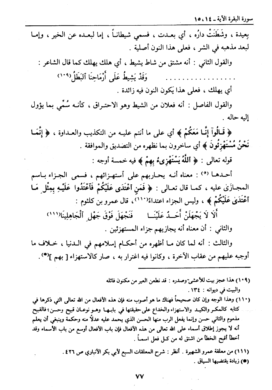 أي يهلك , فعلى هذا يكون النون فيه زائدة. والقول الفاصل: أنه فعلان من الشيط وهو الاحتراق , كأنه سُمِّي بما يؤول إليه حاله. {قَالُوا إِنَّا مَعَكُمْ} أي على ما أنتم عليه من التكذيب والعداوة , {إِنَّمَا نَحْنُ مُسْتَهْزِئُونَ} أي ساخرون بما نظهره من التصديق والموافقة. قوله تعالى: {اللهُ يَسْتَهْزئُ بِهِمْ} فيه خمسة أوجه: أحدها: معناه أنه يحاربهم على استهزائهم , فسمي الجزاء باسم المجازى عليه , كما قال تعالى: {فَمَنِ اعْتَدَى عَلَيْكُمْ فَاعْتَدُوا عَلَيْه بِمِثْلِ مَا اعْتَدَى عَلَيْكُمْ} , وليس الجزاء اعتداءً , قال عمرو بن كلثوم: