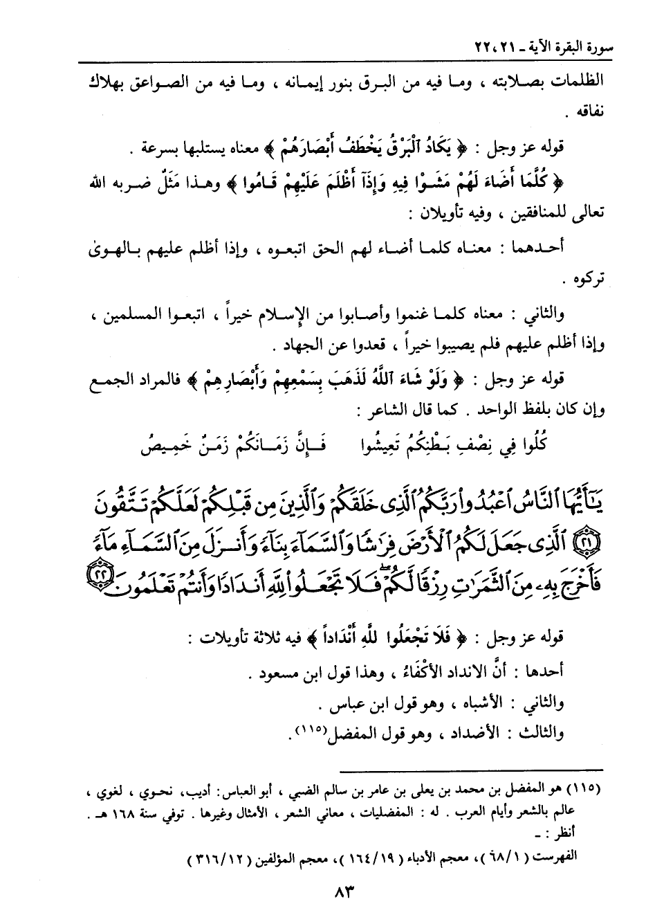 {يا أيها الناس اعبدوا ربكم الذي خلقكم والذين من قبلكم لعلكم تتقون الذي جعل لكم الأرض فراشا والسماء بناء وأنزل من السماء ماء فأخرج به من الثمرات رزقا لكم فلا تجعلوا لله أندادا وأنتم تعلمون} قوله عز وجل: {فَلاَ تَجْعَلُوا للهِ أنْداداً} فيه ثلاثة تأويلات: أحدها: أنَّ الأنداد الأكْفَاءُ , وهذا قول ابن مسعود. والثاني: الأشباه , وهو قول ابن عباس. والثالث: الأضداد , وهو قول المفضل.