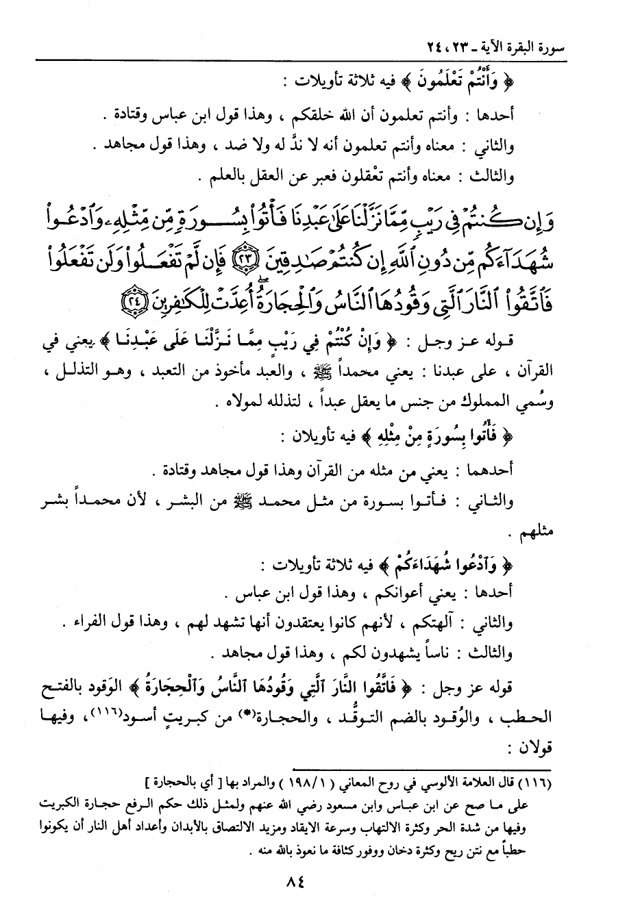 {وإن كنتم في ريب مما نزلنا على عبدنا فأتوا بسورة من مثله وادعوا شهداءكم من دون الله إن كنتم صادقين فإن لم تفعلوا ولن تفعلوا فاتقوا النار التي وقودها الناس والحجارة أعدت للكافرين} قوله عز وجل: {وَإِنْ كُنْتُمْ في رَيْبٍ مِمَّا نَزَّلْنَا عَلَى عَبْدِنَا} يعني في القرآن , على عبدنا: يعني محمداً صلى الله عليه وسلم , والعبد مأخوذ من التعبد , وهو التذلل , وسُمي المملوك من جنس ما يعقل عبداً , لتذلله لمولاه. {فَأْتُوا بِسُورَةٍ مِنْ مِثْلِهِ} فيه تأويلان: أحدهما: يعني من مثله من القرآن , وهذا قول مجاهد وقتادة. والثاني: فأتوا بسورة من مثل محمد صلى الله عليه وسلم من البشر , لأن محمداً بشر مثلهم. {وَادْعُوا شُهَدَاءَكُمْ} فيه ثلاثة تأويلات: أحدها: يعني أعوانكم , وهذا قول ابن عباس. والثاني: آلهتكم , لأنهم كانوا يعتقدون أنها تشهد لهم , وهذا قول الفراء. والثالث: ناساً يشهدون لكم , وهذا قول مجاهد. قوله عز وجل: {فَاتَّقُوا النَّارَ الَّتي وَقُودُهَا النَّاسُ وَالْحِجَارَةُ} الوَقود بالفتح الحطب , والوُقود بالضم التوقُّد , والحجارة من كبريتٍ أسود , وفيها قولان: