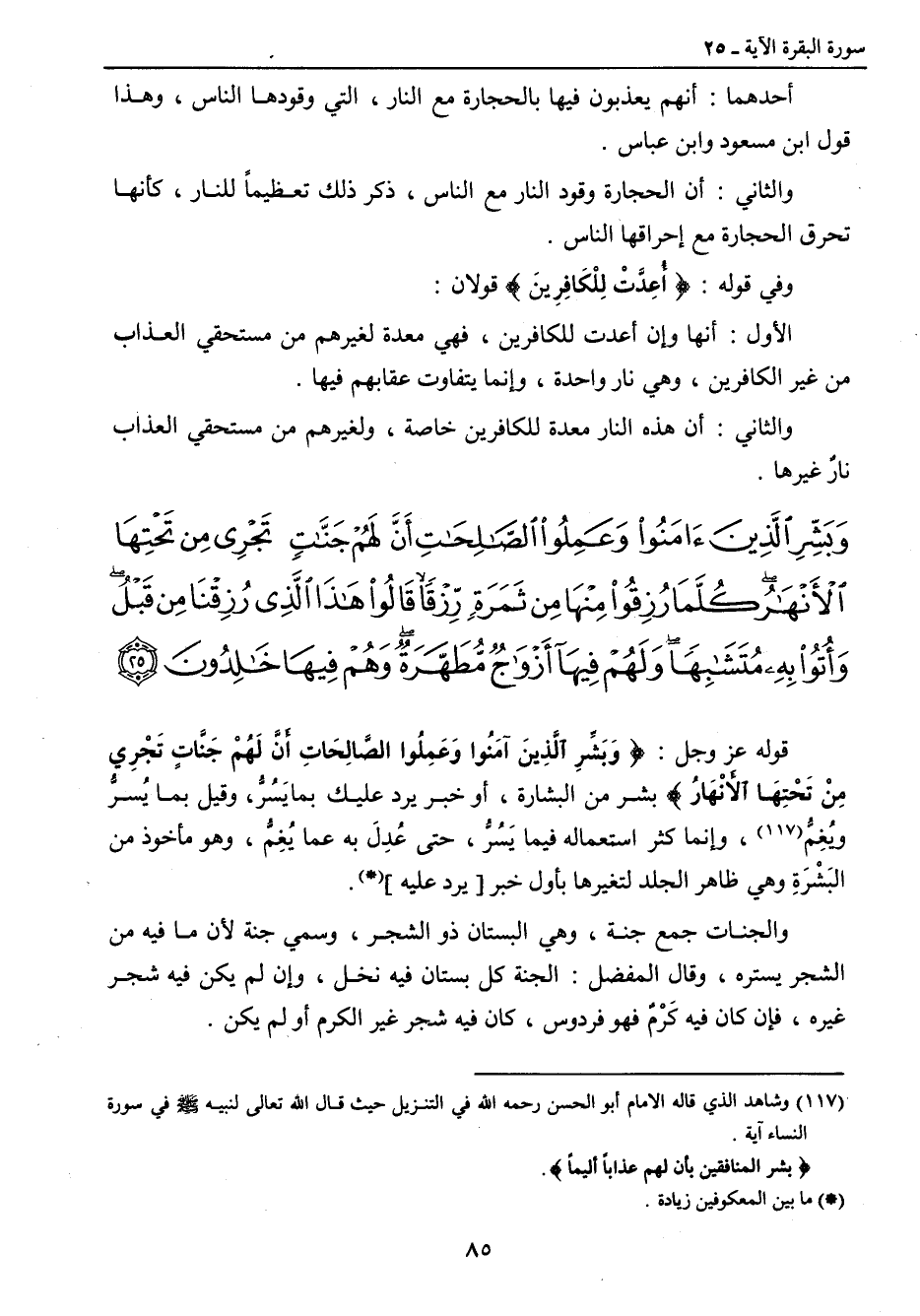 {وبشر الذين آمنوا وعملوا الصالحات أن لهم جنات تجري من تحتها الأنهار كلما رزقوا منها من ثمرة رزقا قالوا هذا الذي رزقنا من قبل وأتوا به متشابها ولهم فيها أزواج مطهرة وهم فيها خالدون} قوله عز وجل: {وَبَشِّرِ الَّذِينَ آمَنُوا وَعَمِلُوا الصَّالِحَاتِ أَنَّ لَهُمْ جَنَّاتٍ تَجْرِي مِنْ تَحْتِهَا الأَنْهَارُ} بشر من البشارة , أو خبر يرد عليك بما يَسُرُّ , وقيل بما يُسرُّ ويُغِمُّ , وإنما كثر استعماله فيما يَسُرُّ , حتى عُدِلَ به عما يُغِمُّ , وهو مأخوذ من البَشْرَةِ وهي ظاهر الجلد لتغيرها بأول خبر [يرد عليه]. والجنات جمع جنة , وهي البستان ذو الشجر , وسمي جنة لأن ما فيه من الشجر يستره , وقال المفضل: الجنة كل بستان فيه نخل , وإن لم يكن فيه شجر غيره , فإن كان فيه كَرْمٌ فهو فردوس , كان فيه شجر غير الكرم أو لم يكن.