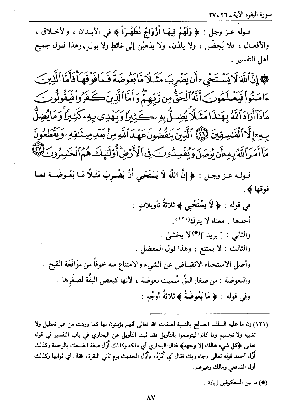 {إن الله لا يستحيي أن يضرب مثلا ما بعوضة فما فوقها فأما الذين آمنوا فيعلمون أنه الحق من ربهم وأما الذين كفروا فيقولون ماذا أراد الله بهذا مثلا يضل به كثيرا ويهدي به كثيرا وما يضل به إلا الفاسقين الذين ينقضون عهد الله من بعد ميثاقه ويقطعون ما أمر الله به أن يوصل ويفسدون في الأرض أولئك هم الخاسرون} قوله عز وجل: {إِنَّ اللهَ لاَ يَسْتَحْيِي أَنْ يَضْرِبَ مَثَلاً مَا بَعُوضَة فما فوقها}. في قوله: {لاَ يَسْتَحْيِي} ثلاثةُ تأويلاتٍ: أحدها: معناه لا يترك (121). والثاني: [يريد] لا يخشى. والثالث: لا يمتنع , وهذا قول المفضل. وأصل الاستحياء الانقباض عن الشيء والامتناع منه خوفاً من موَاقَعَةِ القبح. والبعوضة: من صفار البقِّ سُميت بعوضة , لأنها كبعض البقَّة لصِغَرِها. وفي قوله: {مَا بَعُوضَةً} ثلاثةُ أوجُهٍ: