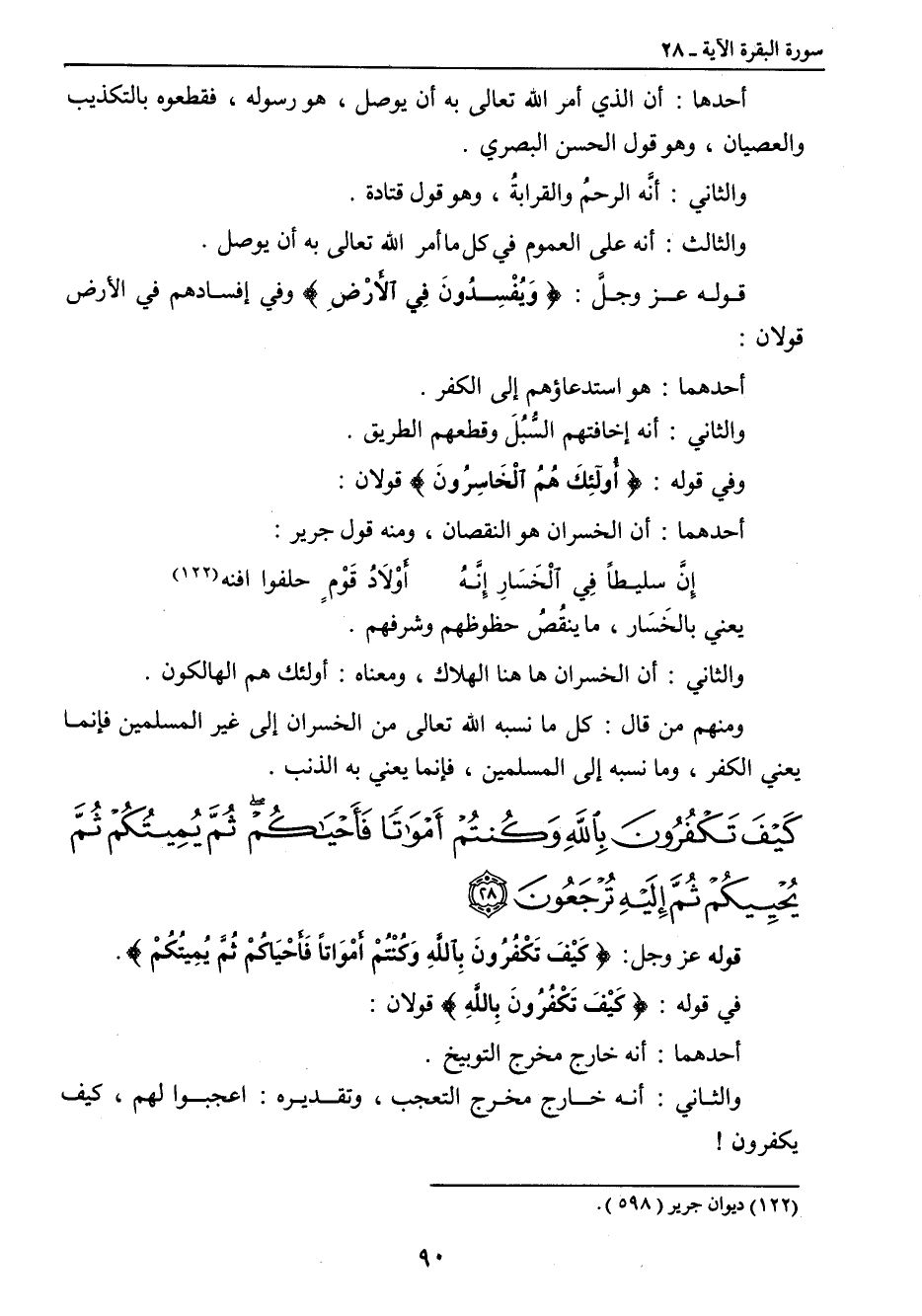أحدها: أن الذي أمر الله تعالى به أن يوصل , هو رسوله , فقطعوه بالتكذيب والعصيان , وهو قول الحسن البصري. والثاني: أنَّه الرحمُ والقرابةُ , وهو قول قتادة. والثالث: أنه على العموم في كل ما أمر الله تعالى به أن يوصل. قوله عز وجلَّ: {وَيُفْسِدُونَ في الأَرْضِ} وفي إفسادهم في الأرض قولان: أحدهما: هو استدعاؤهم إلى الكفر. والثاني: أنه إخافتهم السُّبُلَ وقطعهم الطريق. وفي قوله: {أُولئِكَ هُمُ الْخَاسِرُونَ} قولان: أحدهما: أن الخسران هو النقصان , ومنه قول جرير: