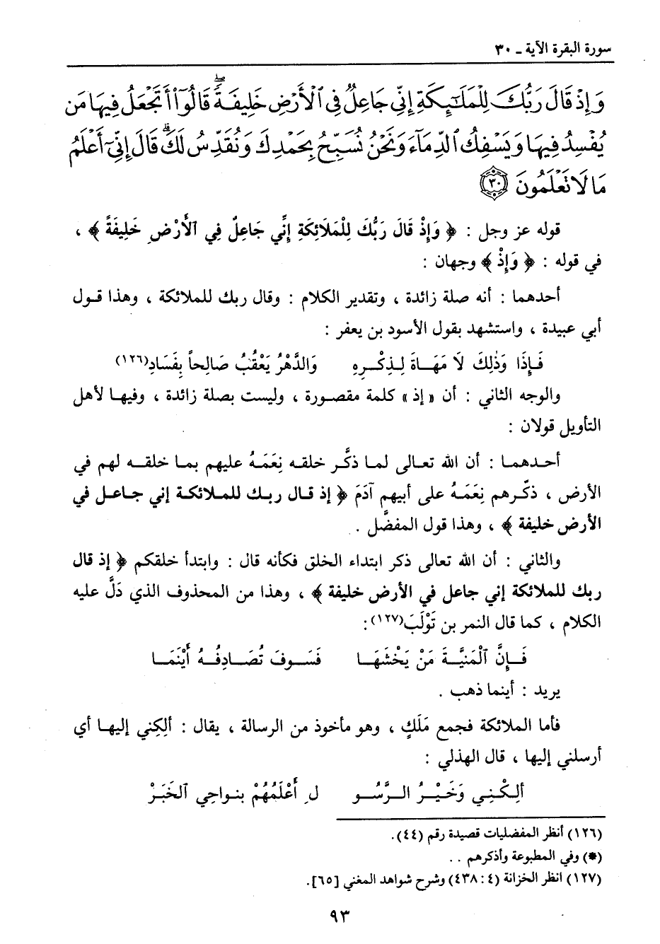 والوجه الثاني: أن (إذ) كلمة مقصورة , وليست بصلة زائدة , وفيها لأهل التأويل قولان: أحدهما: أن الله تعالى لما ذكَّر خلقه نِعَمَهُ عليهم بما خلقه لهم في الأرض , ذكّرهم نِعَمَهُ على أبيهم آدَمَ {إذ قال ربك للملائكة إني جاعل في الأرض خليفة} , وهذا قول المفضَّل. والثاني: أن الله تعالى ذكر ابتداء الخلق فكأنه قال: وابتدأ خلقكم {إذ قال ربك للملائكة إني جاعل في الأرض خليفة} , وهذا من المحذوف الذي دَلَّ عليه الكلام , كما قال النمر بن تَوْلَبَ (127):