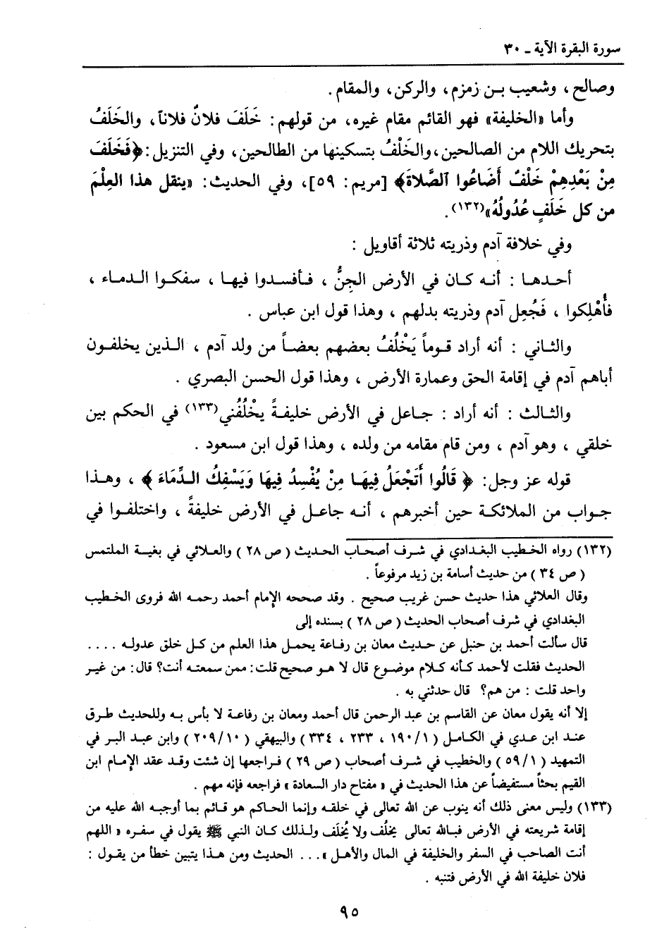 وصالح , وشعيب بن زمزم , والركن , والمقام. وأما (الخليفة) فهو القائم مقام غيره , من قولهم: خَلَفَ فلانٌ فلاناً , والخَلَفُ بتحريك اللام من الصالحين , والخَلْفُ بتسكينها من الطالحين , وفي التنزيل: {فَخَلَفَ مِنْ بَعْدِهِمْ خَلْفٌ أَضَاعُوا الصَّلاةَ} [مريم: 59] , وفي الحديث: (ينقل هذا العِلْمَ من كل خَلَفٍ عُدُولُهُ). وفي خلافة آدم وذريته ثلاثة أقاويل: أحدها: أنه كان في الأرض الجِنُّ , فأفسدوا فيها , سفكوا الدماء , فأُهْلِكوا , فَجُعِل آدم وذريته بدلهم , وهذا قول ابن عباس. والثاني: أنه أراد قوماً يَخْلُفُ بعضهم بعضاً من ولد آدم , الذين يخلفون أباهم آدم في إقامة الحق وعمارة الأرض , وهذا قول الحسن البصري. والثالث: أنه أراد: جاعل في الأرض خليفةً يخْلُفُني في الحكم بين خلقي , وهو آدم , ومن قام مقامه من ولده , وهذا قول ابن مسعود. قوله عز وجل: {قَالُوا أَتَجْعَلُ فِيهَا مِنْ يُفْسِدُ فِيهَا وَيَسْفِكُ الدِّمَاءَ} , وهذا جواب من الملائكة حين أخبرهم , أنه جاعل في الأرض خليفةً , واختلفوا في