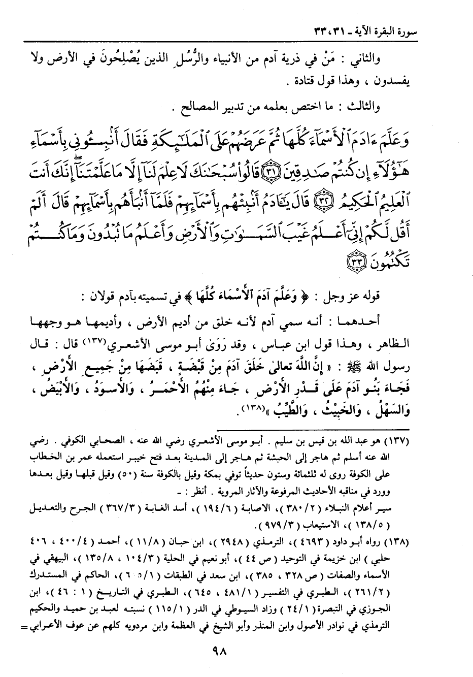 {وعلم آدم الأسماء كلها ثم عرضهم على الملائكة فقال أنبئوني بأسماء هؤلاء إن كنتم صادقين قالوا سبحانك لا علم لنا إلا ما علمتنا إنك أنت العليم الحكيم قال يا آدم أنبئهم بأسمائهم فلما أنبأهم بأسمائهم قال ألم أقل لكم إني أعلم غيب السماوات والأرض وأعلم ما تبدون وما كنتم تكتمون} قوله عز وجل: {وَعَلَّمَ آدَمَ الأَسْمَاءَ كُلَّهَا} في تسميته بآدم قولان: أحدهما: أنه سمي آدم لأنه خلق من أديم الأرض , وأديمها هو وجهها الظاهر , وهذا قول ابن عباس , وقد رَوَى أبو موسى الأشعري قال: قال رسول الله صلى الله عليه وسلم: (إِنَّ اللهَ تعالى خَلَقَ آدَمَ مِنْ قَبْضَةٍ , قَبَضَها مِنْ جَمِيعِ الأَرْضِ , فَجَاءَ بَنُو آدَمَ عَلَى قَدْرِ الأَرْضِ , جَاءَ مِنْهُمُ الأَحْمَرُ , وَالأَسوَدُ , وَالأبْيَضُ , وَالسَهْلُ , وَالخَبِيْثُ , وَالطَّيِّبُ).