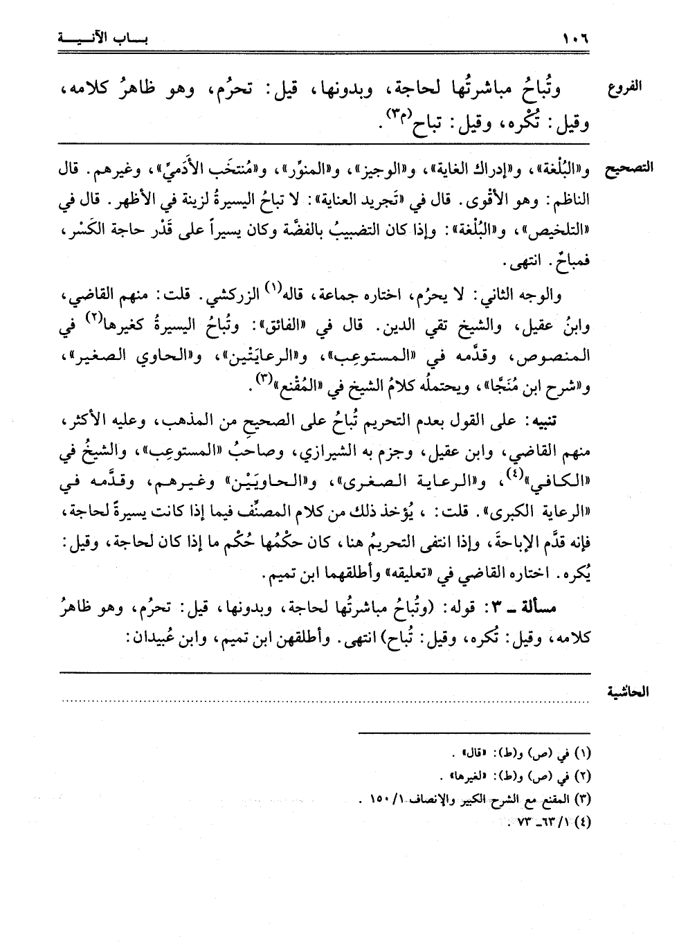 تَنْبِيهٌ: عَلَى الْقَوْلِ بِعَدَمِ التَّحْرِيمِ تُبَاحُ عَلَى الصَّحِيحِ مِنْ الْمَذْهَبِ، وَعَلَيْهِ الْأَكْثَرُ، مِنْهُمْ الْقَاضِي، وَابْنُ عَقِيلٍ وَجَزَمَ بِهِ الشِّيرَازِيُّ، وَصَاحِبُ الْمُسْتَوْعِبِ، وَالشَّيْخُ فِي الْكَافِي4، وَالرِّعَايَةِ الصُّغْرَى، وَالْحَاوِيَيْنِ وَغَيْرِهِمْ، وَقَدَّمَهُ فِي الرِّعَايَةِ الْكُبْرَى قُلْت: وَيُؤْخَذُ ذَلِكَ مِنْ كَلَامِ الْمُصَنِّفِ فِيمَا إذَا كَانَتْ يَسِيرَةً لِحَاجَةٍ، فَإِنَّهُ قَدَّمَ الْإِبَاحَةَ وَإِذَا انْتَفَى التَّحْرِيمُ هُنَا كَانَ حُكْمُهَا حُكْمَ مَا إذَا كَانَ لِحَاجَةٍ، وَقِيلَ: يُكْرَهُ، اخْتَارَهُ الْقَاضِي فِي تَعْلِيقِهِ وَأَطْلَقَهُمَا ابْنُ تَمِيمٍ.