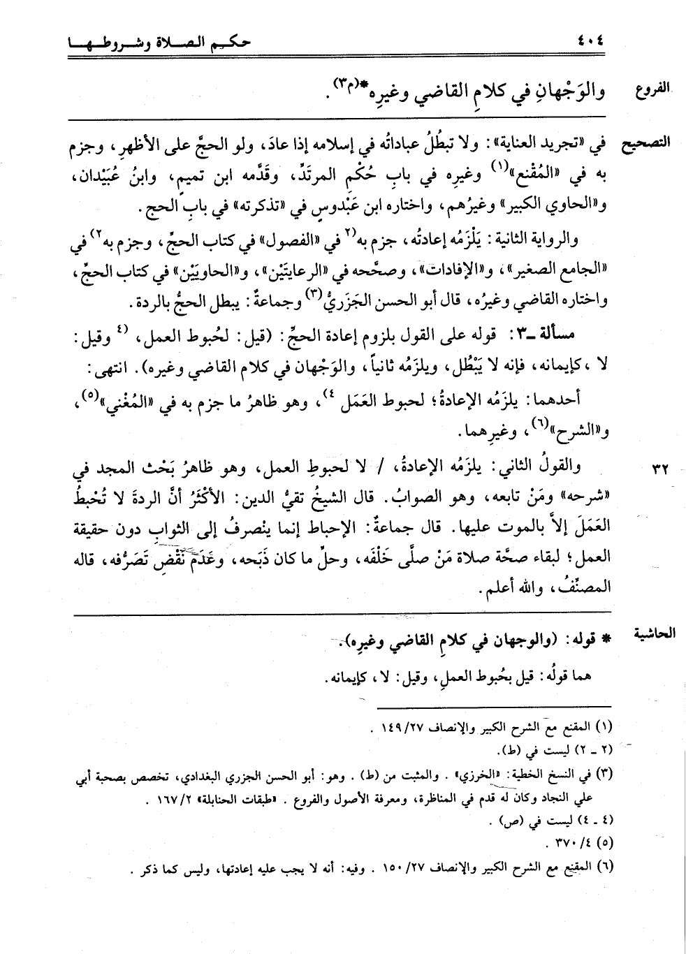 وَالْقَوْلُ الثَّانِي: يَلْزَمُهُ الْإِعَادَةُ،/ لَا لِحُبُوطِ الْعَمَلِ، وَهُوَ ظَاهِرُ بَحْثِ الْمَجْدِ فِي "شَرْحِهِ" وَمَنْ تَابَعَهُ، وَهُوَ الصَّوَابُ. قَالَ الشَّيْخُ تَقِيُّ الدِّينِ: الأكثر أن الرد لَا تُحْبِطُ الْعَمَلَ إلَّا بِالْمَوْتِ عَلَيْهَا. قَالَ جَمَاعَةٌ: الْإِحْبَاطُ إنَّمَا يَنْصَرِفُ إلَى الثَّوَابِ دُونَ حَقِيقَةِ الْعَمَلِ، لِبَقَاءِ صِحَّةِ صَلَاةِ مَنْ صَلَّى خلفه، وحل ما كان ذبحه، وعدم نقض تصرفه، قاله المصنف، والله أعلم