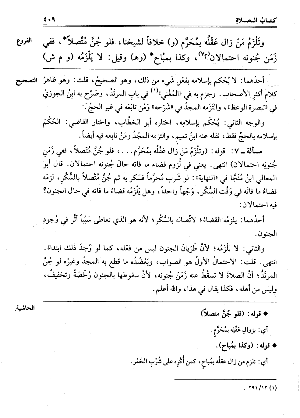 مَسْأَلَةُ – 7: قَوْلُهُ: "وَيَلْزَمُ مَنْ زَالَ عَقْلُهُ بِمُحَرَّمٍ ... فَلَوْ جُنَّ مُتَّصِلًا فَفِي زَمَنِ جُنُونِهِ احْتِمَالَانِ" انْتَهَى، يَعْنِي فِي لُزُومِ قَضَاءِ مَا فَاتَهُ حَالَ جُنُونِهِ احْتِمَالَانِ، قَالَ أَبُو الْمَعَالِي بْنُ مُنَجَّى فِي النِّهَايَةِ: لَوْ شَرِبَ مُحَرَّمًا فَسَكِرَ بِهِ ثُمَّ جُنَّ مُتَّصِلًا بِالسُّكْرِ لَزِمَهُ قَضَاءُ مَا فَاتَهُ فِي وَقْتِ السُّكْرِ، وَجْهًا وَاحِدًا، وَهَلْ يَلْزَمُهُ قَضَاءُ مَا فَاتَهُ فِي حَالِ الْجُنُونِ؟ فِيهِ احْتِمَالَانِ: